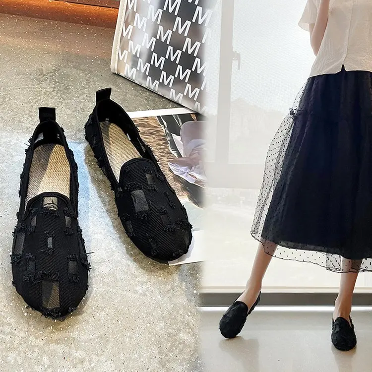 Туфли женские холщовые, дышащие сетчатые однотонные, кружевная мягкая подошва, без каблука, лоферы, 2021