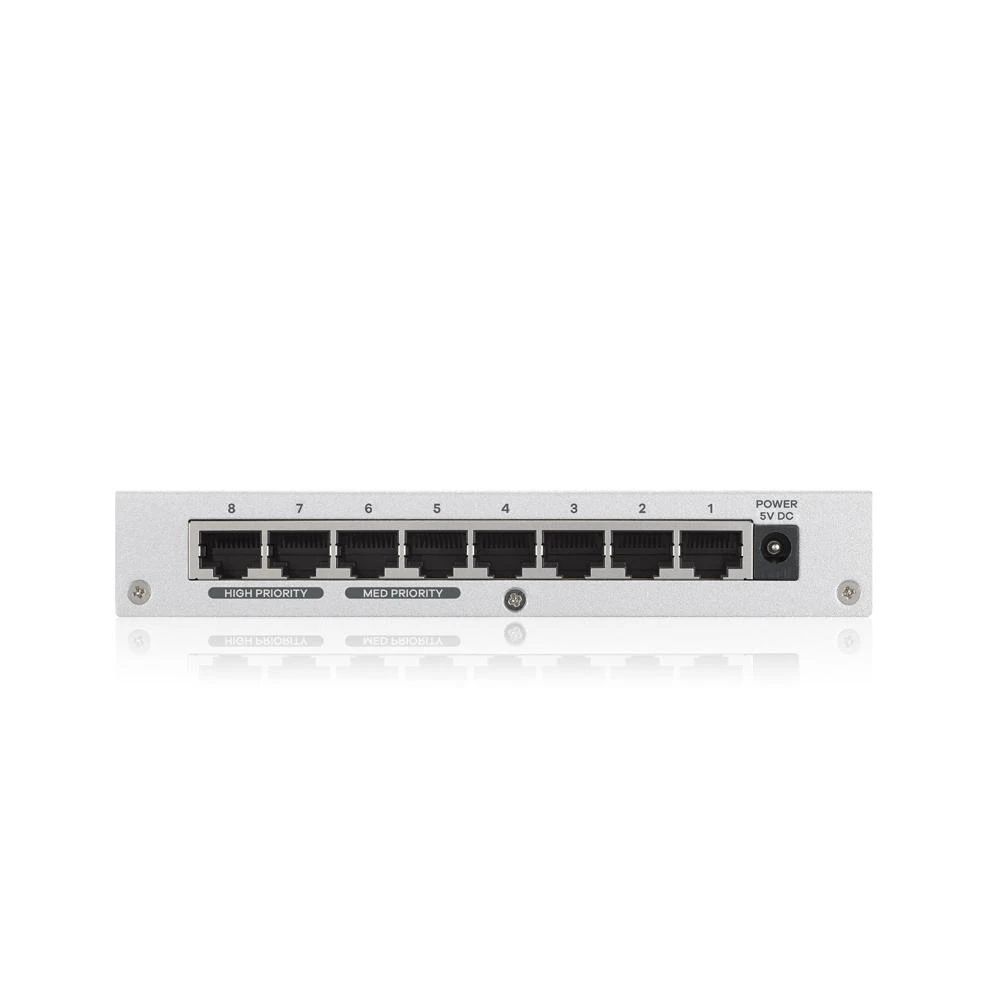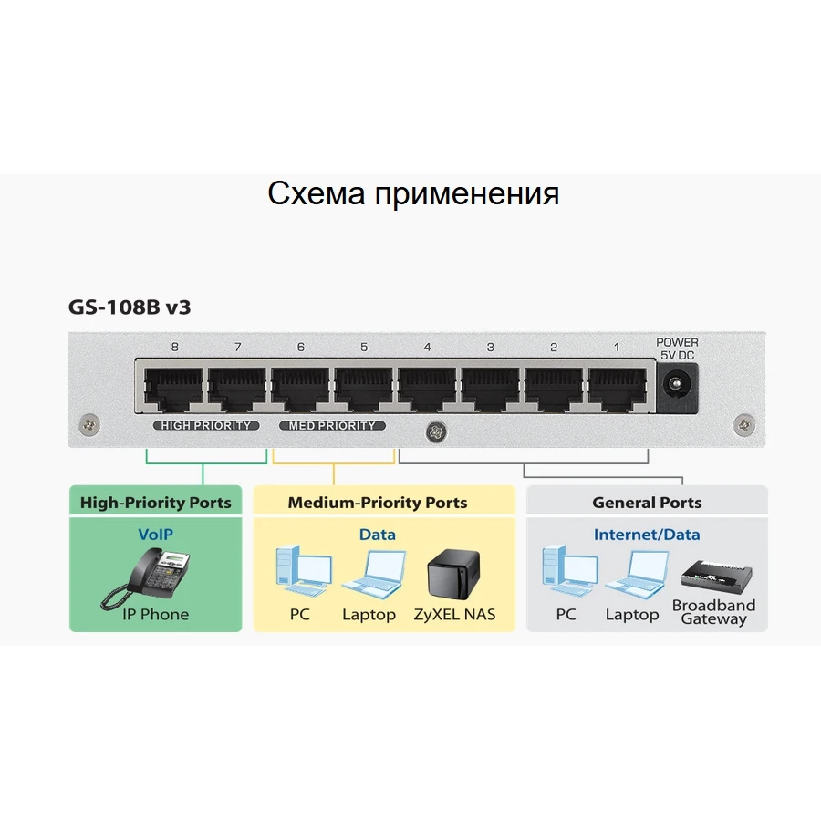 8-портовый настольный коммутатор Gigabit Ethernet. Таблица MAC-адресов 8 тыс. Буфер памяти: 128 KB. Фабрика коммутации (неблокирующая) 16 Gbps. Auto-MDI/MDIX на всех портах. Поддержка пакетов Jumbo до 9 KB. Два порта high-priority QoS и два порта medium-priority QoS. Техническое описание Спецификация системы Стандарты IEEE 802.3 10BASE-T Ethernet IEEE 802.3u 100BASE-TX Fast Ethernet IEEE 802.3ab 1000BASE-T Gigabit Ethernet IEEE 802.3 Nway auto-negotiation IEEE 802.3x full duplex operation and flow control IEEE 802.3az Energy Efficient Ethernet Производительность Скорость передачи данных (half duplex/full duplex): Ethernet: 10/20 Mbps Fast Ethernet: 100/200 Mbps Gigabit Ethernet: 1000/2000 Mbps Таблица MAC-адресов: 8 тыс. Буфер памяти: 128 KB Фабрика коммутации (неблокирующая): 16 Gbps Функции Auto-MDI/MDIX на всех портах Метод передачи: архитектура Store-and-forward Поддержка обнаружения петель Поддержка QoS на базе портов Поддержка пакетов Jumbo до 9 KB Спецификация оборудования Интерфейс Восемь портов 10/100 Mbps Ethernet с поддержкой MDI/MDIX Порты QoS Два порта high-priority QoS и два порта medium-priority QoS Светодиодные индикаторы PWR: Power (Питание) У каждого порта: Link/Activity Желтый: 10/100 Mbps Зеленый: 1000 Mbps Источник питания Вход: 100 - 240 В переменного тока, 50/60 Hz Выход: 5 В постоянного тока, 1 А Энергопотребление: максимум 3.0 Ватт Физические характеристики Размеры без упаковки (WxDxH): 155 x 85 x 26 мм Вес без упаковки: 325 г"