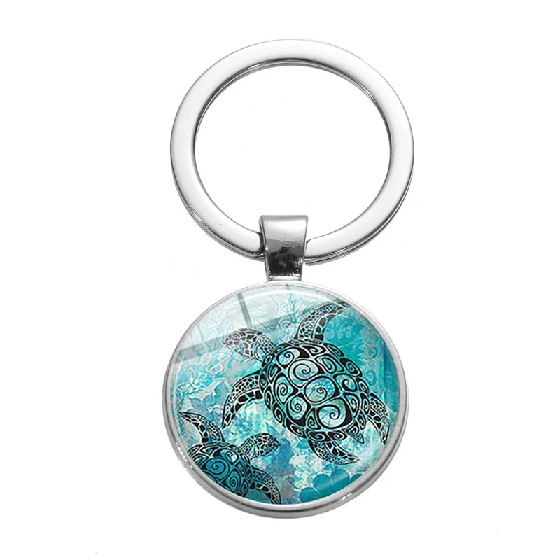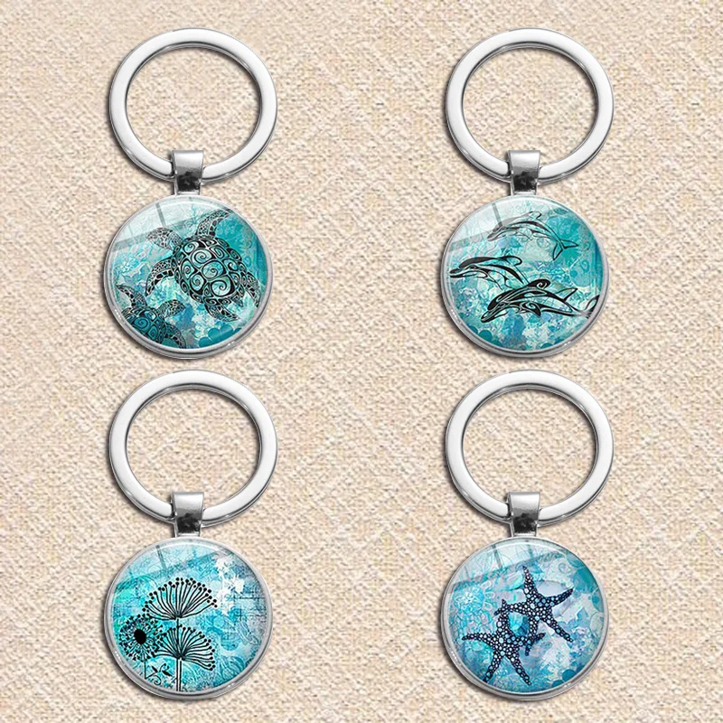 Настраиваемый брелок для ключей Морская жизнь, морская звезда, морская черепаха, брелок с дельфином, круглый металлический стеклянный брелок для ключей, подвеска