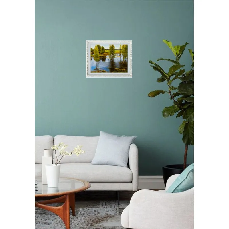 Прекрасный Пейзаж русской природы от современного художника Юрия арсенюка. Полуводная река с цветущей калугой, сочными молодыми листьями и зеленью, создают все это великолепие на холсте.