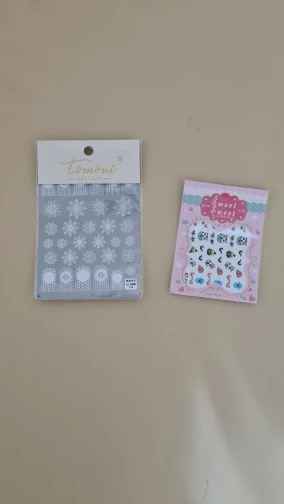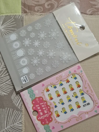 Доставка 3 недели,трек отслеживался. Соответствуют фото на сайте.Отличные наклейки,ультратонкие и аккуратные,не корявые сделаны отлично. Настоящее снежное кружево, единственно что многие большеваты, буду обрезать пополам и компоновать на ногте. Своих денег однозначно стоят.В подарок положили наклейки с миньонами,отдам детям.