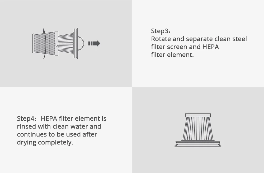 Шаг 3: поверните и отделите чистый стальной фильтр-экран и HEPA фильтрующий элемент Шаг 4: фильтрующий элемент HEPA промывается чистой водой и продолжает использоваться после полного высыхания.