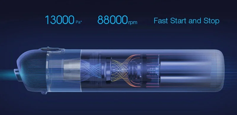 Использование высокопроизводительных бесщеточных двигателей и внутренняя конструкция с двойным воздуховодом может эффективно уменьшить потери энергии и повысить эффективность очистки. Оснащен функцией быстрого запуска, чтобы избежать попадания пыли в всасывающий рот при выключении. Мощная мощность 13000 па, скорость двигателя 88000 об/мин, чрезвычайно быстрый запуск и остановка, предотвращает утечку пыли.
