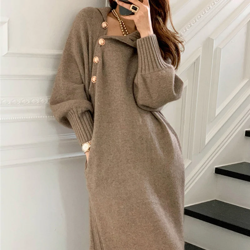 Женское трикотажное платье на пуговицах, Элегантное длинное теплое ...