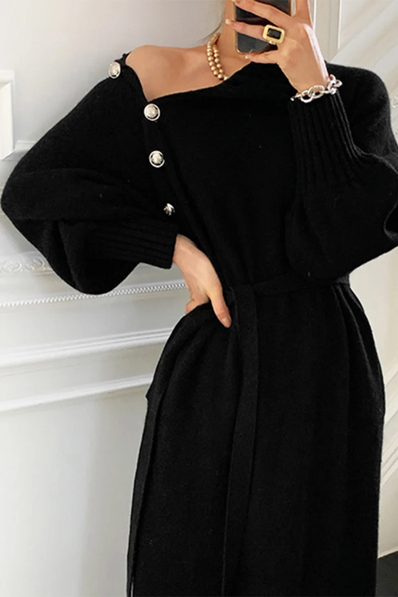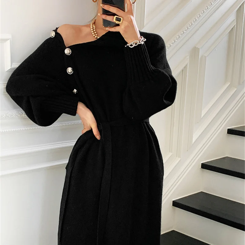 Дизайнерское черное трикотажное платье-свитер, женское плотное вязаное платье-свитер 2021, корейские теплые зимние платья-джемперы, повседневные однотонные Новые