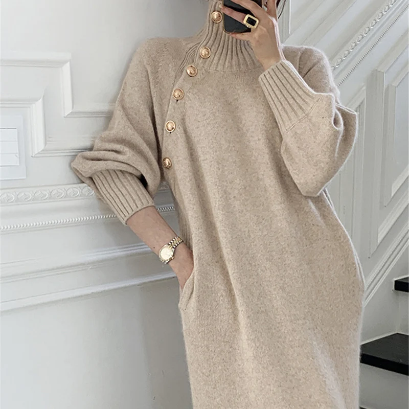 Женское трикотажное платье-свитер на пуговицах, с высоким воротником