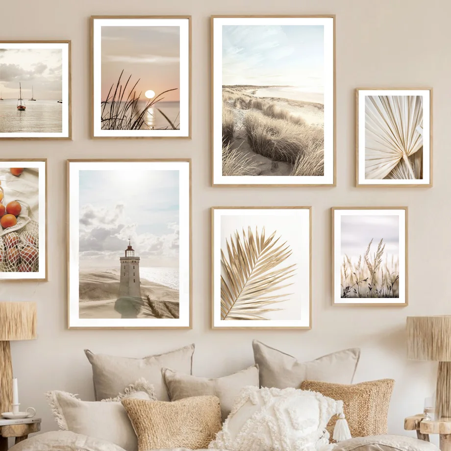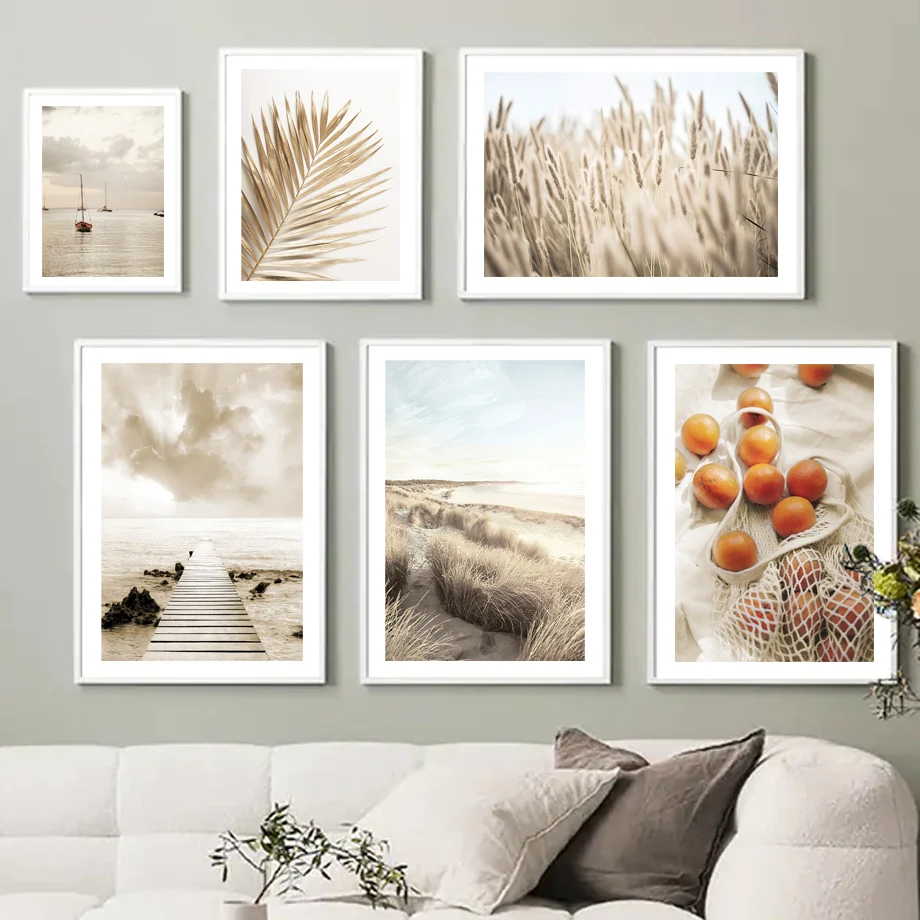 Скандинавский плакат с бежевыми листьями пальмы, солнечным морским путем, трава, оранжевая тростниковая стена, художественный принт, холст, картина, Декор, фотографии для гостиной