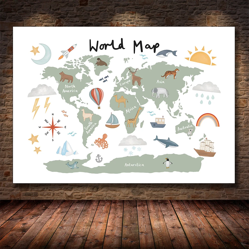 Детская карта мира с дикой природой, Картина на холсте, красочная детская Настенная картина, картина для детской комнаты, домашний декор