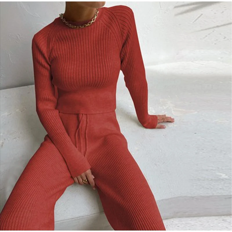 Женский трикотажный брючный костюм, Однотонный свитер с круглым выр...