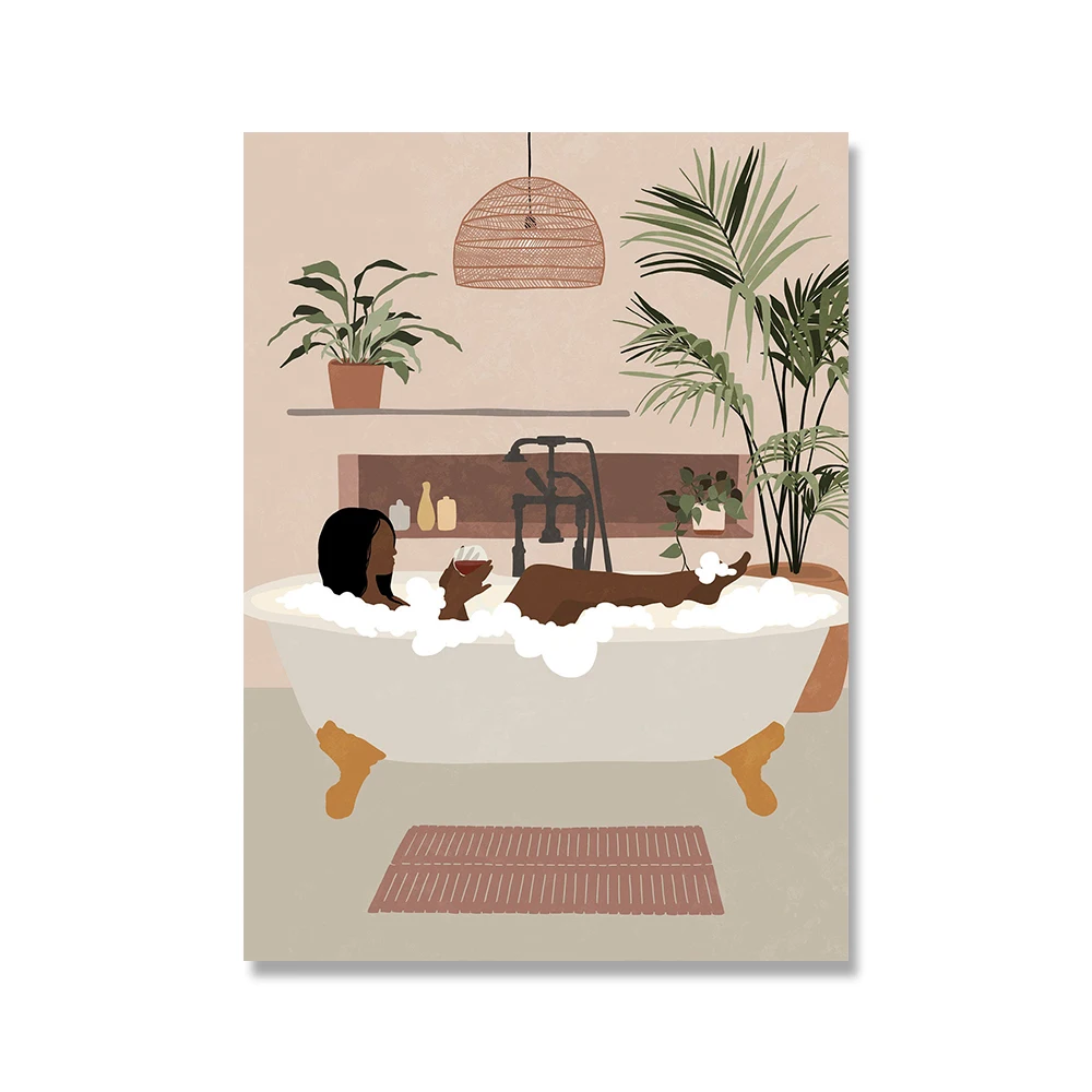 Скандинавские черные женщины принимают ванну в ванной растения стены искусства холст картины плакаты и принты настенные фотографии для украшения для ванной комнаты
