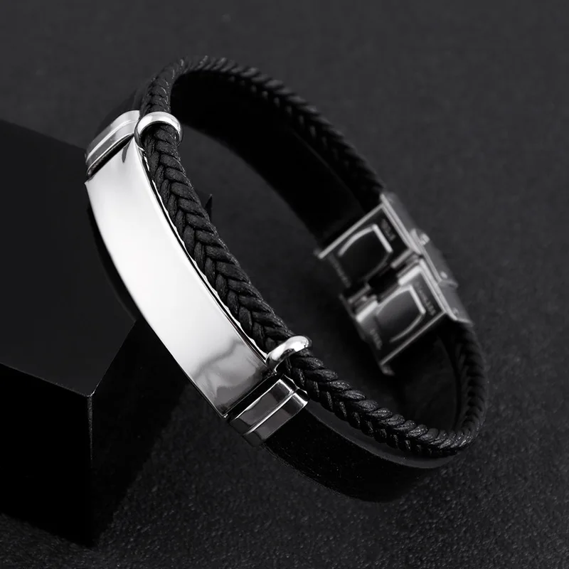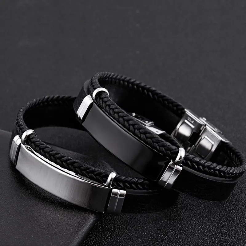 Браслет мужской кожаный, многослойный, черный, из нержавеющей стали