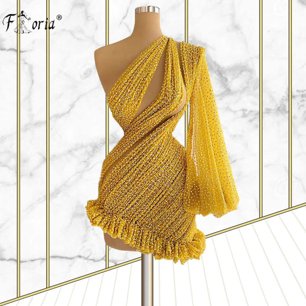 Жемчужные Короткие Выпускные платья с рукавами-фонариками желтого цвета 2021 платье с одним открытым плечом с бисером иллюзионные вечерние платья русалки коктейльное платье для встречи выпускников