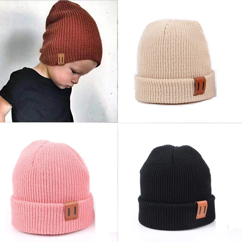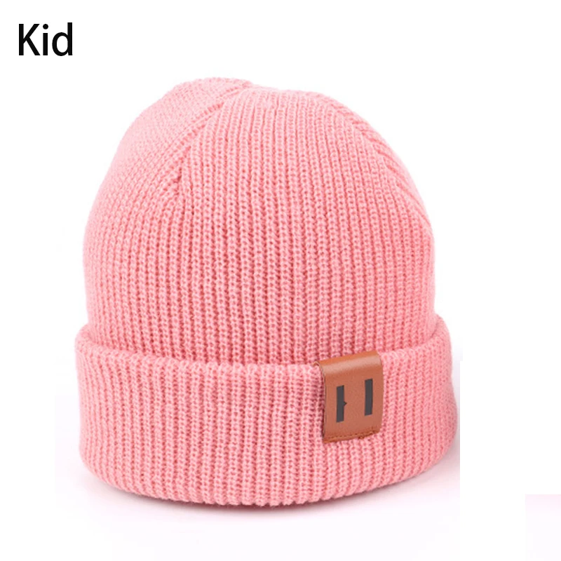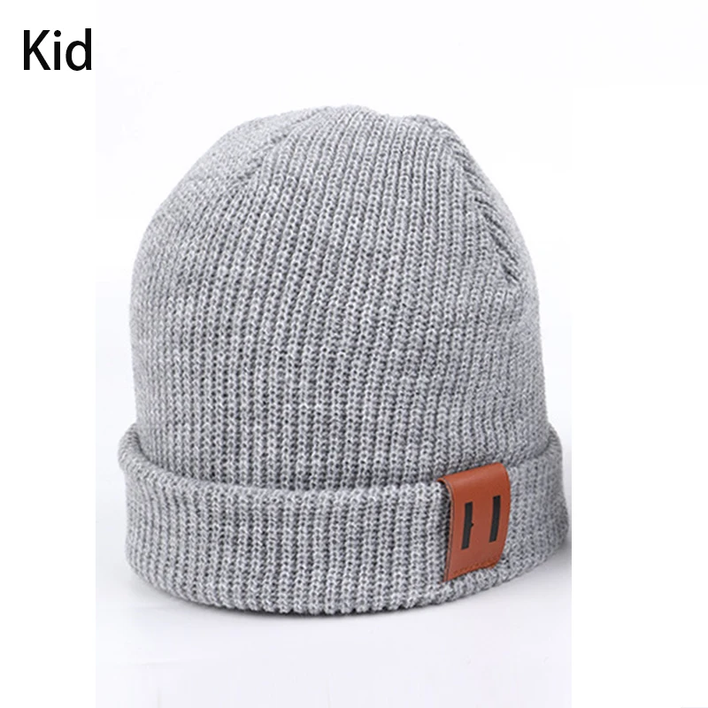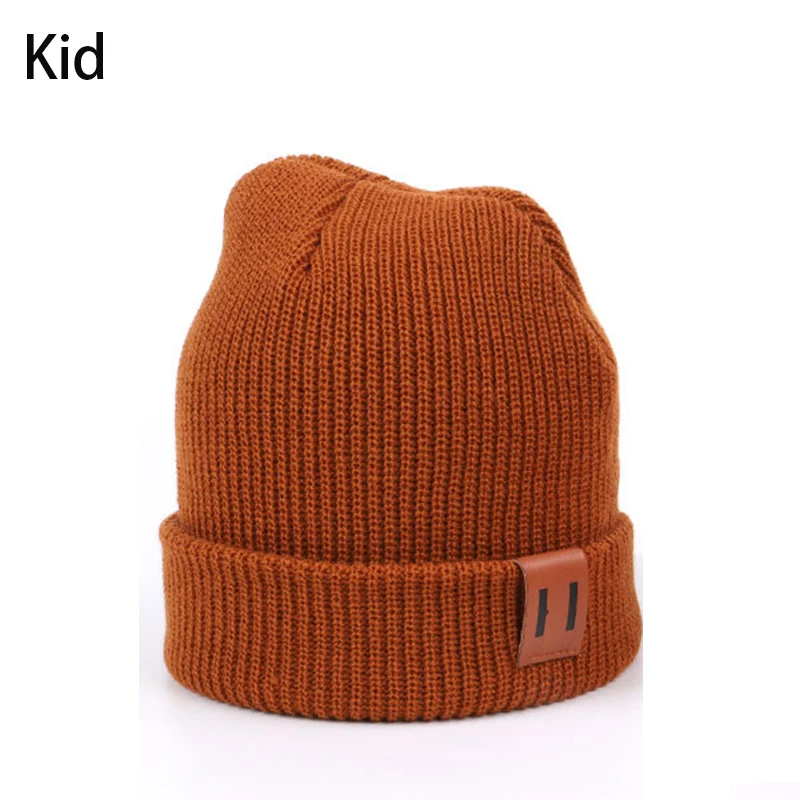 Детская вязаная шапка для мальчиков и девочек на осень и зиму, теплая детская шапка, взрослые и дети, головные уборы с кожаной этикеткой