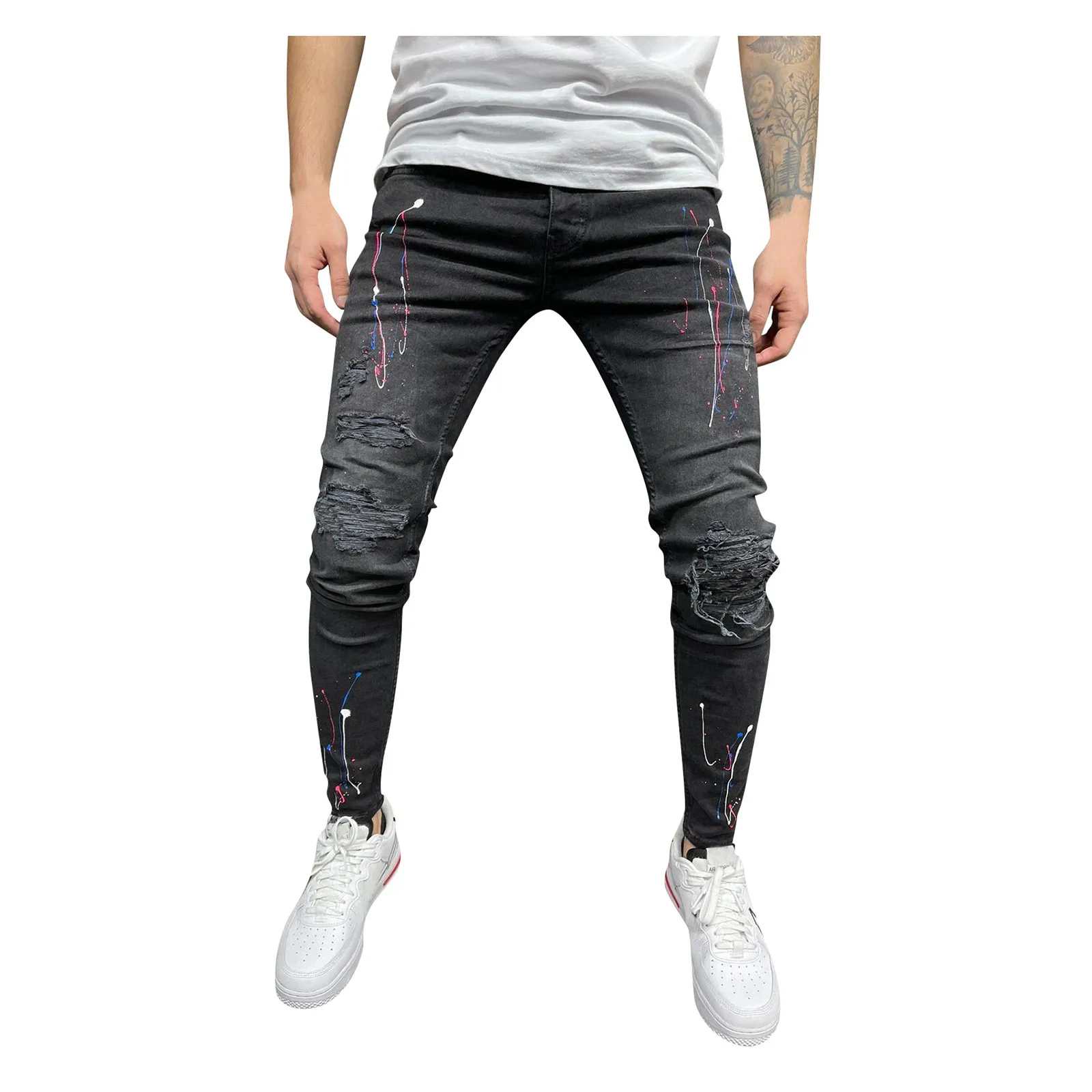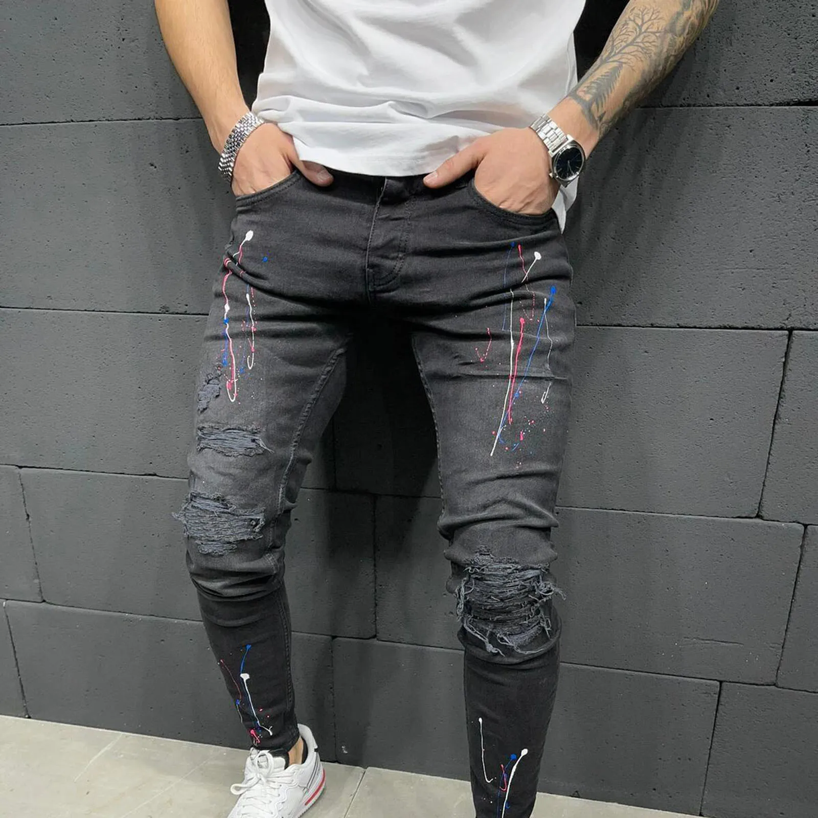 Мужские джинсы-карандаш, зауженные Прямые рваные плиссированные шта...
