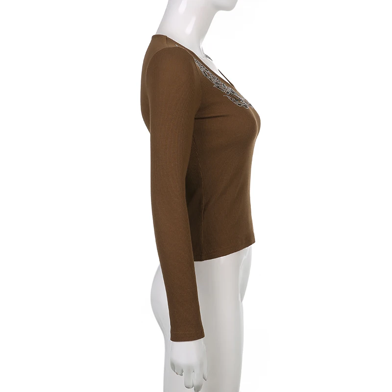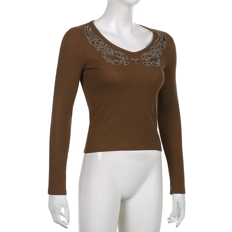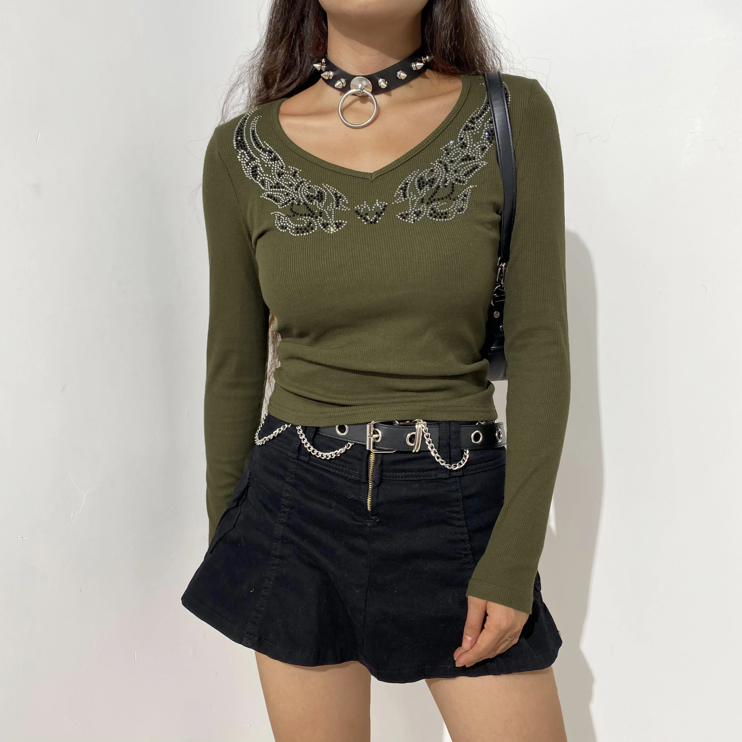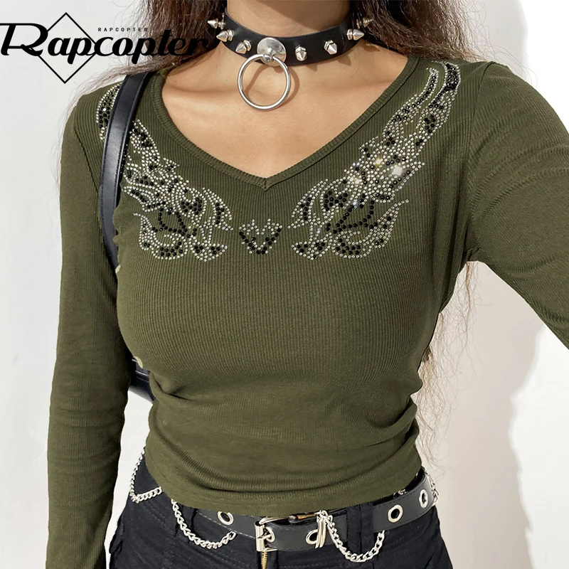 УКОРОЧЕННЫЙ ТОП Rapcopter стразы, гранж, Fairycore, вязаная футболка с длинным рукавом, V-образным вырезом, базовая футболка, Женская Осенняя Повседневная Kawaii, шикарная футболка