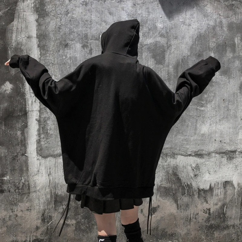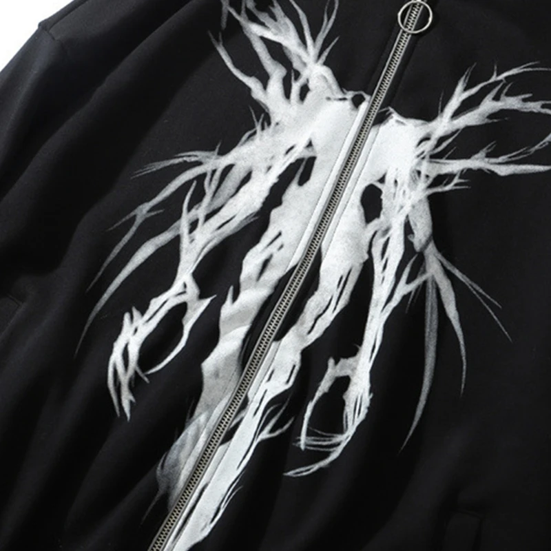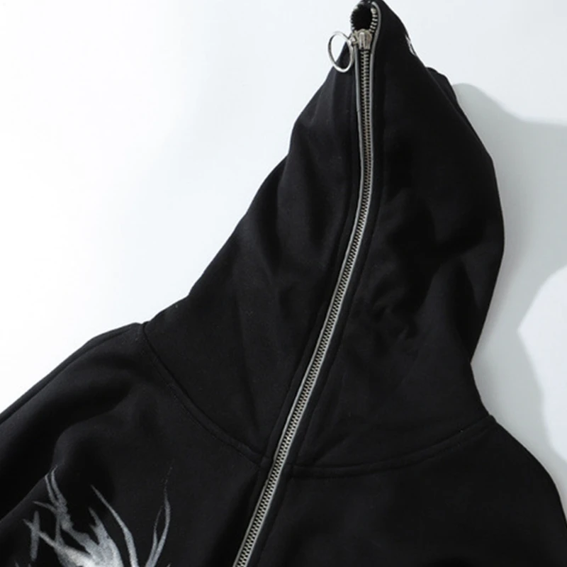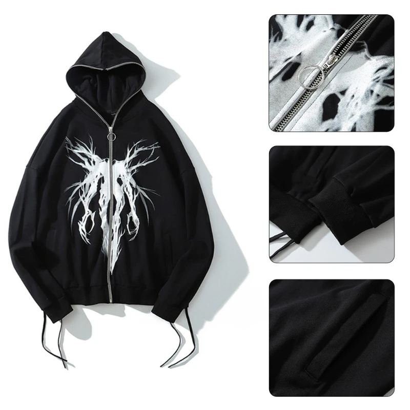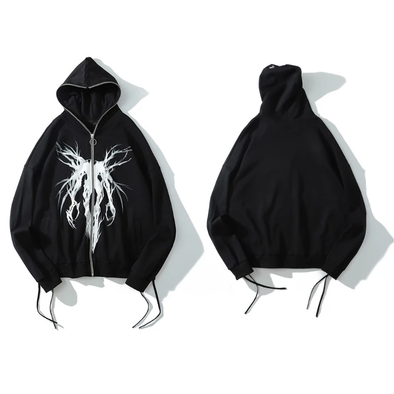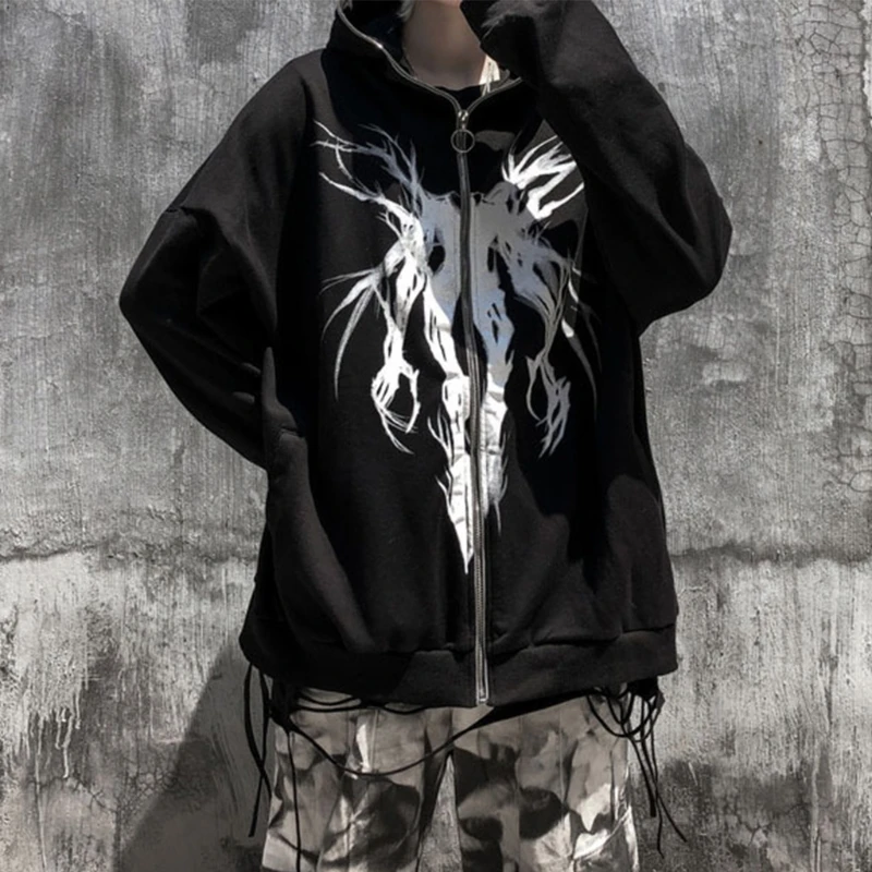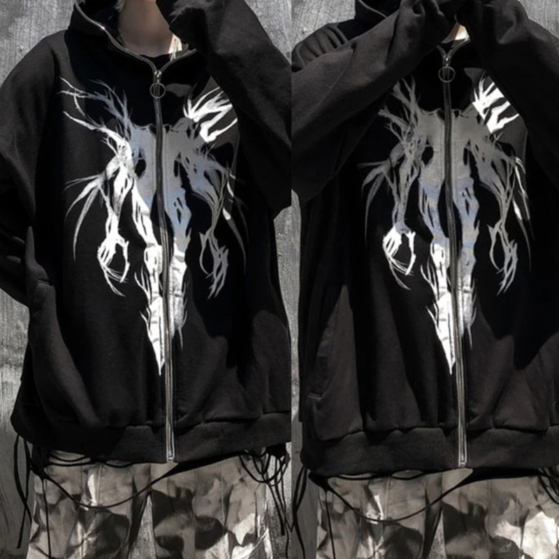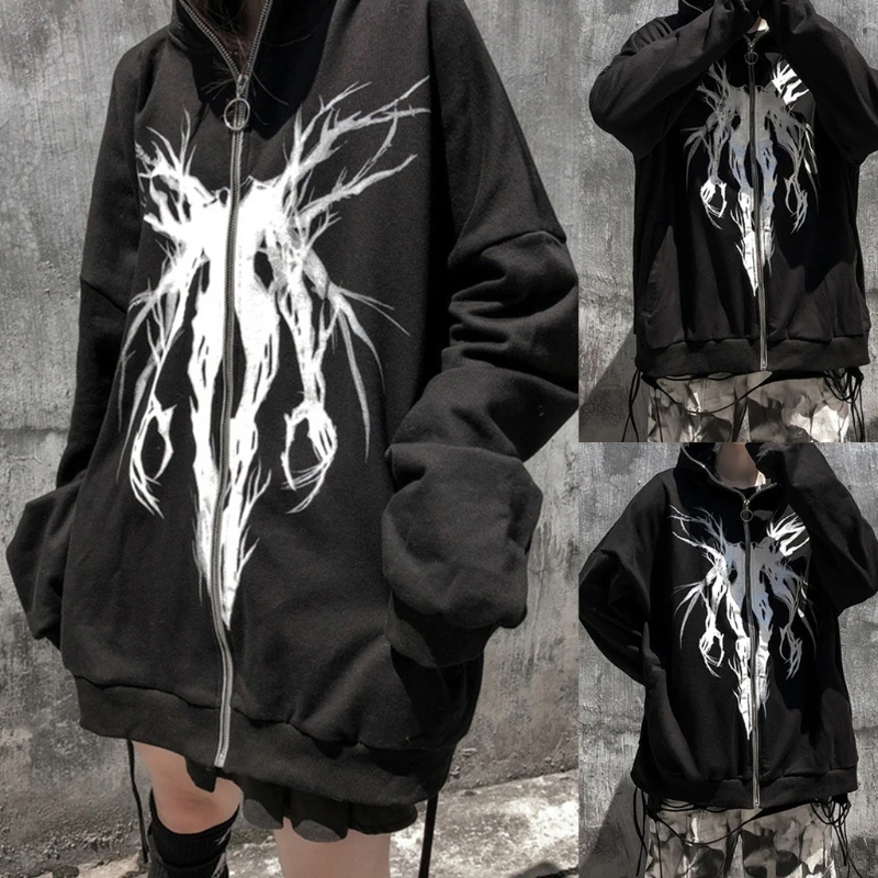 Oversizing Готическая толстовка с капюшоном на молнии для женщин, кардиган с принтом скелета, куртка, пуловер, толстовка с капюшоном, пальто