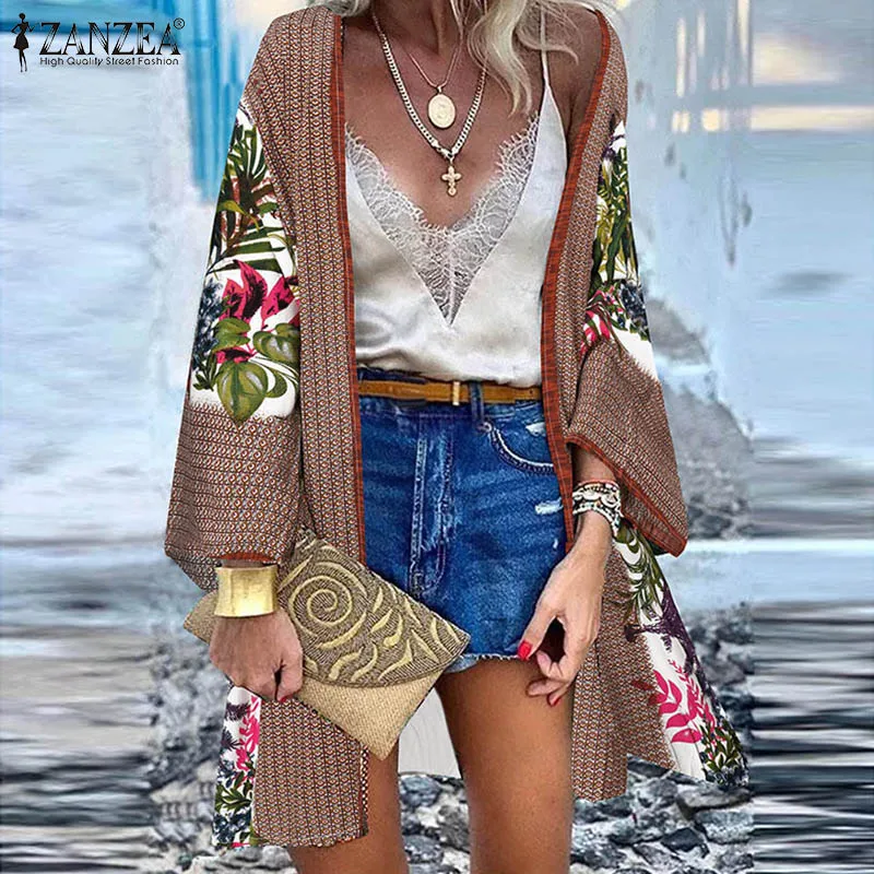 Богемная летняя блузка с цветочным принтом ZANZEA, винтажная Женская пляжная Праздничная кардиган-кимоно, рубашка с длинным рукавом и открытой передней частью, Свободный Топ