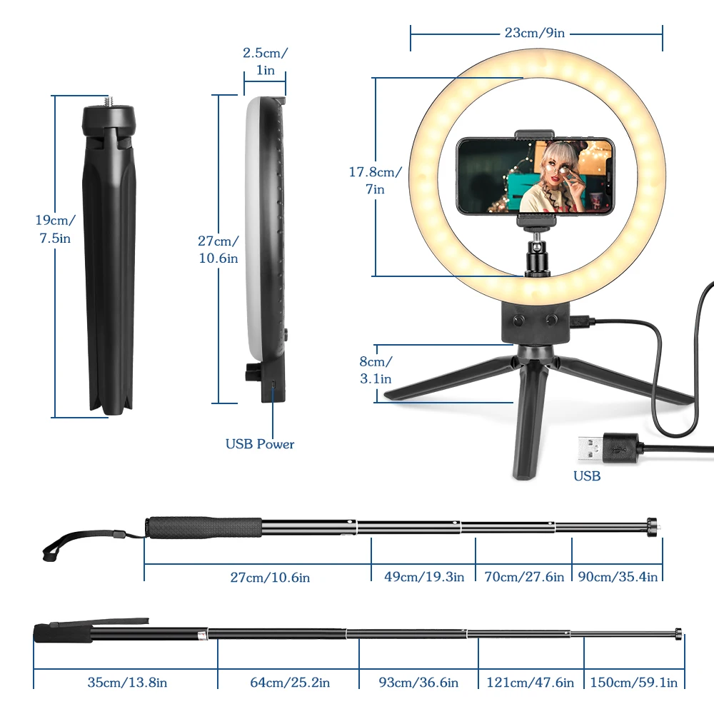 Характеристики:【Game смены кольцевой светильник 】The 9 "кольцевой светильник затемнения с 3 светильник ing режима: белый, теплый белый, желтый, и каждый Цвет режим имеет 9 уровней яркости. С технологией холодного светодиода может использоваться в течение длительного времени без проблем с перегревом. Кольцевой светильник может сделать Ваш визуальный мир более красивым и блестящим. Наш кольцевой светильник может приносить достаточно светильник на ваше лицо или продукт при записи видео. Сделайте детали продукта более четкими и сделайте контур лица более трехмернымМногофункциональное кольцо для селфи Light】 поставляется с подставкой для штатива, которая является прочной и компактной. Помимо того, что это светильник-подставка, он также может служить настольным штативом, это профессиональный инструмент для визажистов, косметологов, создателей контента YouTube, татуировок, видео Блоггеры, парикмахеры/Салоны, любители Селфи, Facebook Live, Instagram Live, Snap chat, Studio lighting, портретной фотографии и потоковой передачи и т. д. легко собрать и снять и отлично подходит для Путешествия【 Универсальный держатель для телефона с поворотом на 360 ° уникальная конструкция зажима на мобильный телефон с гусиной шеей позволяет настроить телефон под наиболее желаемый угол обзора и поддерживать съемку видео по вертикали или горизонтали. Этот держатель сотового телефона ширина составляет до 3,6 дюйма совместим с большинством смартфонов, таких как iPhone, 11, 11Pro, X, K, Xs, Xs, iPhone 8 plus, 8, 7, 7 plus, 6, 6s, 6s Plus 5, 5s, 4, 4s/Samsung Note 8, S8/LG/HTC и т. Д. Усиленный Нескользящий Резиновый зажим для поддержки вашего телефона, не царапая его【Питание USB ed и дистанционное управление 】 батарея не требуется, работает с большинством устройств, поддерживающих usb-порт, таких как ноутбук, ПК, банк питания, зарядное устройство USB, адаптер переменного тока и т. д. Пульт дистанционного управления, который позволяет управлять телефоном с расстояния до 30 футов при съемке фотографий или записи видео, совместим с мобильными телефонами android и iOS