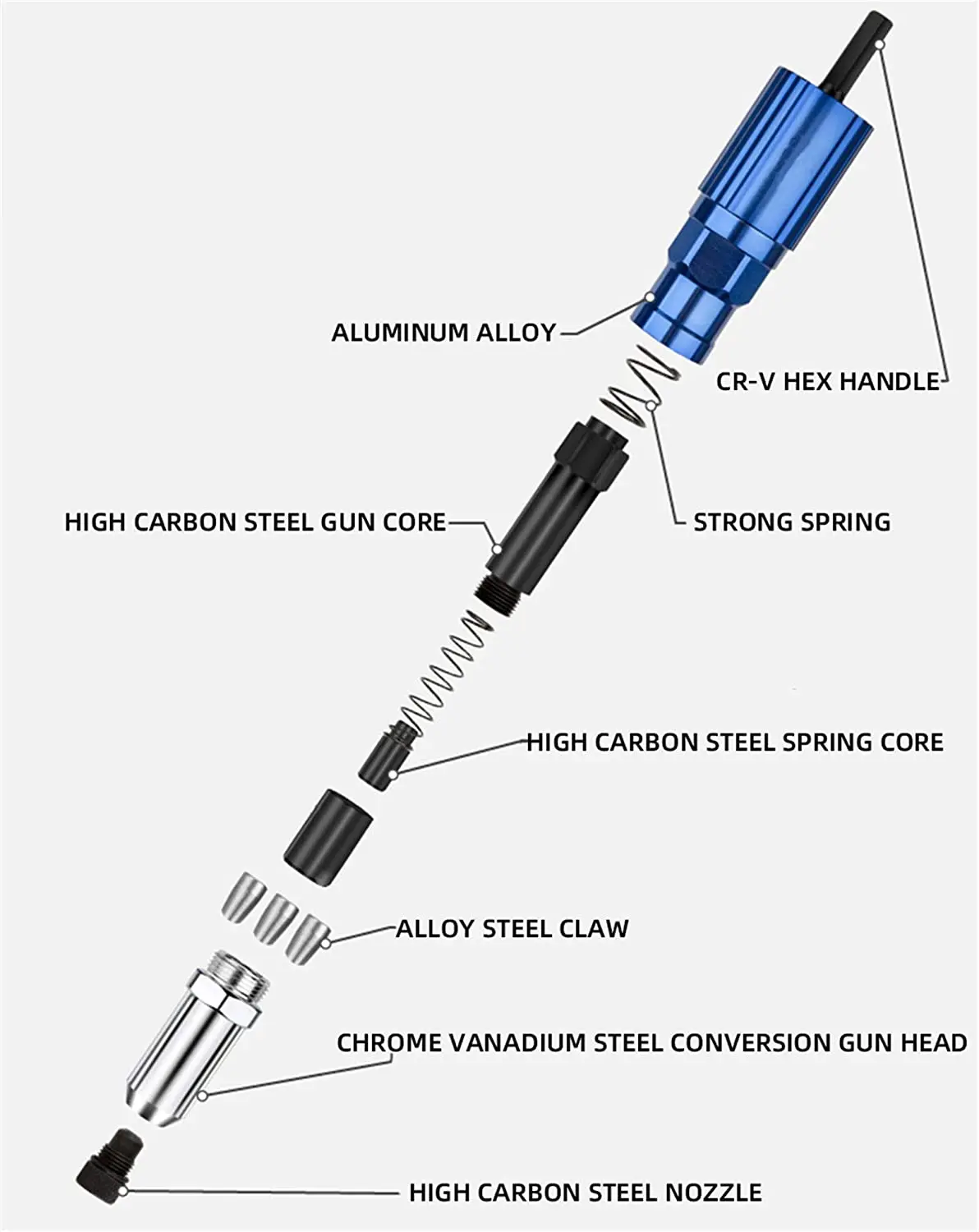 1. При использовании адаптера для заклепного пистолета для нормальной работы необходимо удерживать переднюю ручку.2. Заклепки выше M5 * 20/3,2*20/2,4*20 нельзя использовать.3. Заклепки из нержавеющей стали нельзя использовать.4. Если вы не придерживаетесь процедуры, ноготь застрянет или его нельзя вытянуть.5. Если заклепку нельзя снять, Открутите головку торцевой головки и прижмите гаечным ключом, чтобы вытащить.Если у вас возникнут какие-либо проблемы, пожалуйста, своевременно свяжитесь со службой поддержки клиентов.