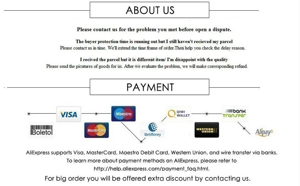 1. Существует множество способов оплаты на Aliexpress, таких как Alipay, кредитные карты, банковские переводы в реальном времени, офлайн-платежи (банковские переводы и Western Union). Вы можете выбрать наиболее удобный для Вас способ. Для защиты ваших интересов оплата будет временно задержана компанией Alibaba и не будет передана нам, пока вы не получите заказ и не подтвердите, что остались им довольны.