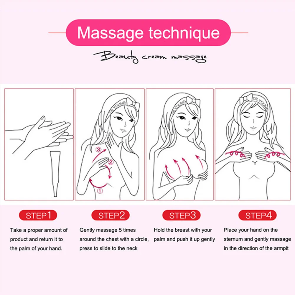 1. Возьмите нужное количество продукта и отмочите его на ладонь.2. Мягко массируйте 5 раз вокруг груди с помощью круга, нажмите, чтобы сползти к шее3. Удерживайте грудь ладонью и мягко Поднимите ее вверх4. Поместите руку на грудину и мягко массируйте в направлении подмышек