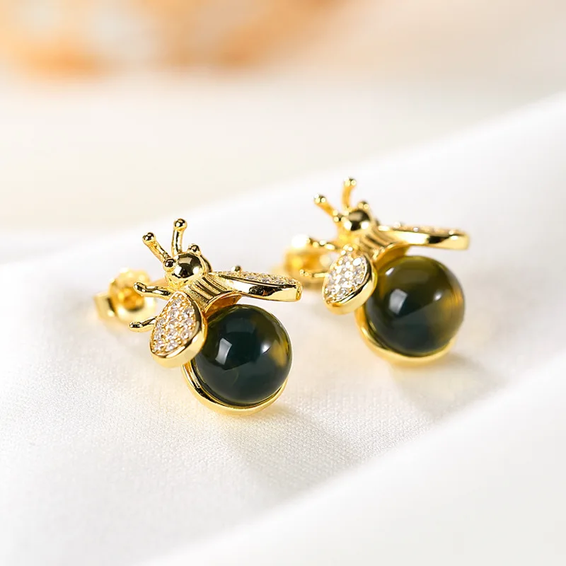 Модные серьги-гвоздики из серебра S925 пробы с натуральным янтарным пивом для женщин, позолоченные Элегантные серьги в виде пчел, вечерние серьги на День святого ВалентинаНаименование товара: натуральные янтарные серьги в виде пчелМеталл: 925 пробы сереброПокрытие: подлинное золотоОсновной камень: синий янтарь из натурального мексиканского обсидианаРазмер камня: 7 ммПовод: повседневная одежда/офисная/Повседневная/вечерние/День рождения/Подарок на годовщину
