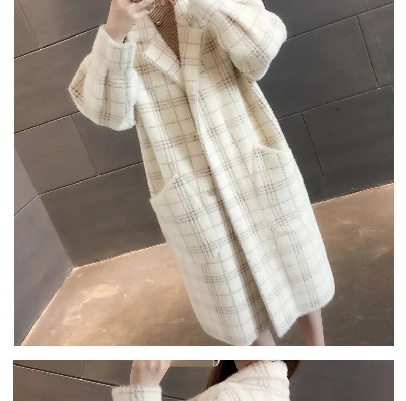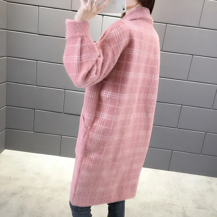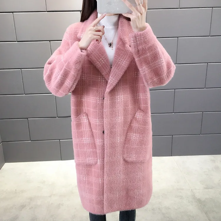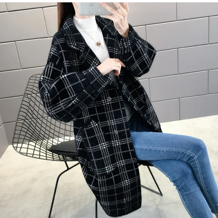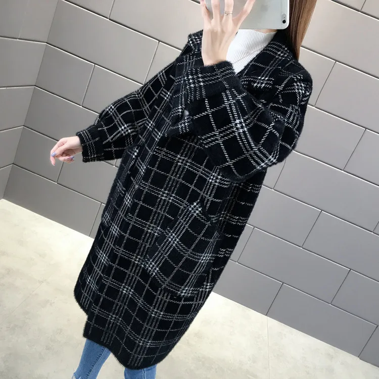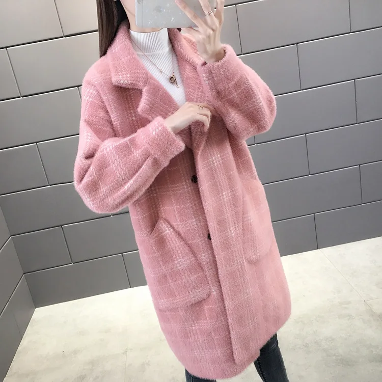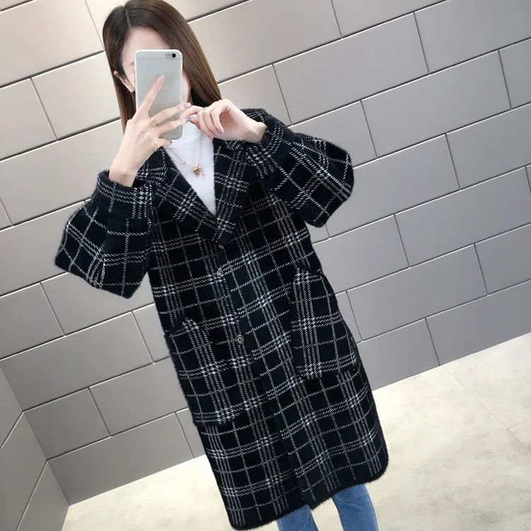 No shed hair Новый кардиган из искусственной норки на флисе для осени и зимы, Женское пальто из норки, плотное пальто средней длины в клетку в Корейском стиле