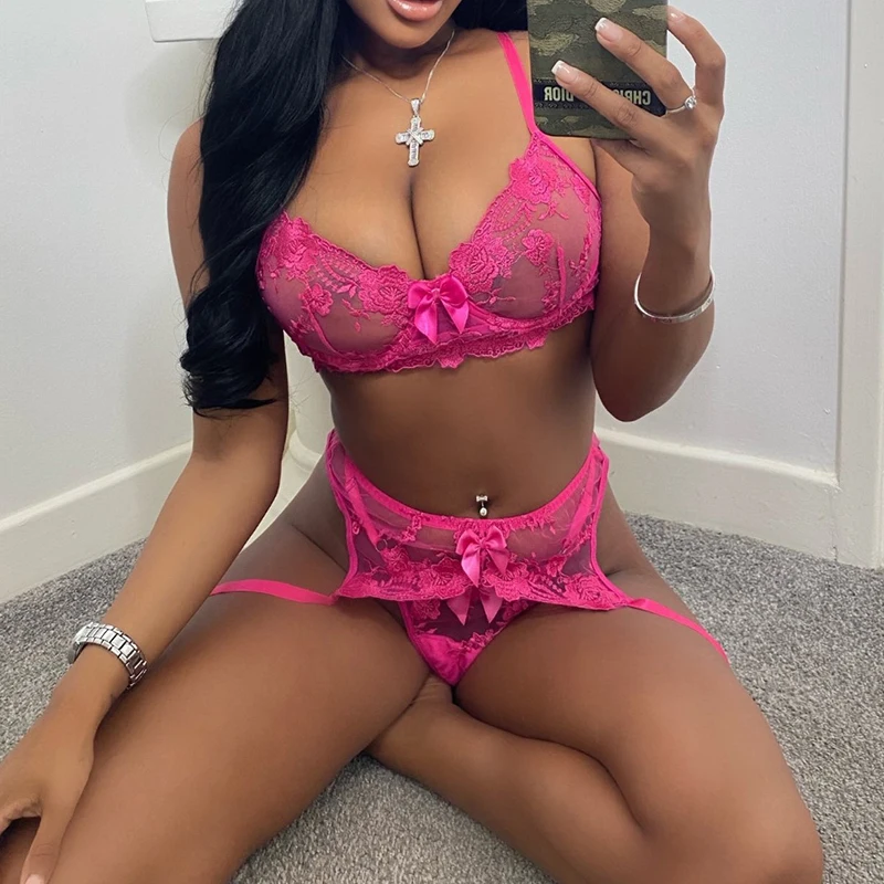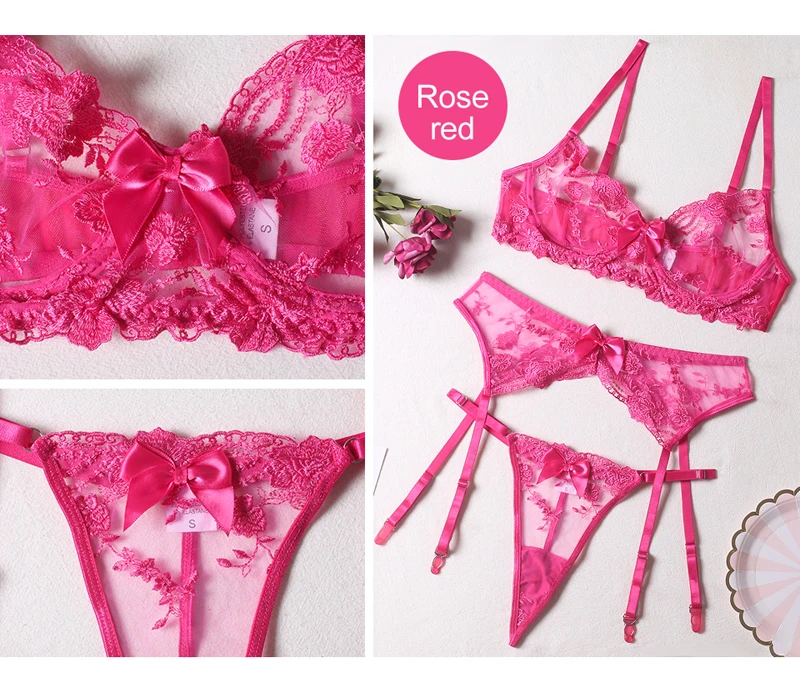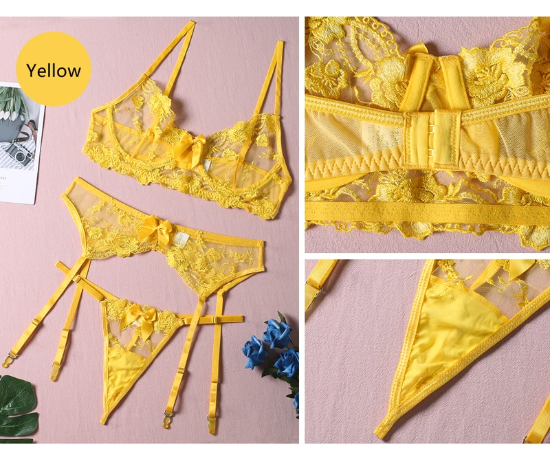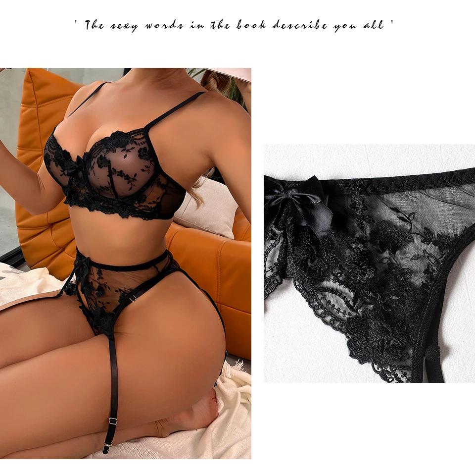 Прозрачный бюстгальтер и трусики с поясом-подвязкой, прозрачный кружевной бюстгальтер пуш-ап, сексуальное нижнее белье с вышивкой, 3 предмета, эротическое белье