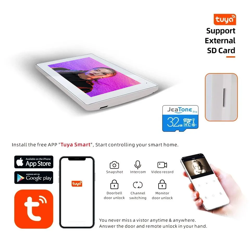 Подключайтесь к приложению Tuya smarthome, вы можете дистанционно управлять, чтобы контролировать, фотографировать или записывать видео. И вы можете поговорить с вашими посетителями и разблокировать для них.Все эти действия, вы можете закончить их с ваш мобильный телефон.