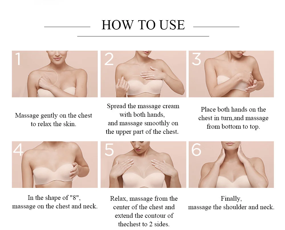Рекомендуется принимать каждый день утром и вечером, с интервалом не менее 6 часов, чтобы дать грудной клетке время для поглощения продукта.Минимум интервал 6 часовИспользуйте 2 раза в деньКак использовать1: мягко массируйте грудь, чтобы расслабить кожу.2: распределите массажный крем обеими руками и гладко массируйте верхнюю часть груди.3: Поместите обе руки на грудь в свою очередь и массируйте снизу4: в форме "8", массаж на груди и шее.5: расслабьтесь, массируйте от центра груди и удлиняйте контур до 2 сторон.