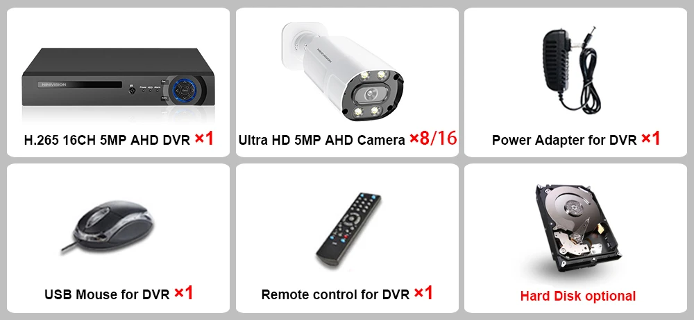 1 X 16CH H.265 AHD 5MP DVR NVR HVR 6 в 1 цифровой видеорегистратор;8/16 x HD 5.0MP Крытый Открытый ИК Полный Цвет ночного видения атмосферостойкие камеры;1 х адаптер питания для DVR;1 X USB мышь для DVR;1 компакт-диск программного обеспечения для DVR;1 пульт дистанционного управления для DVR;Жесткий диск опционально!Видео кабель в комплект не входит!