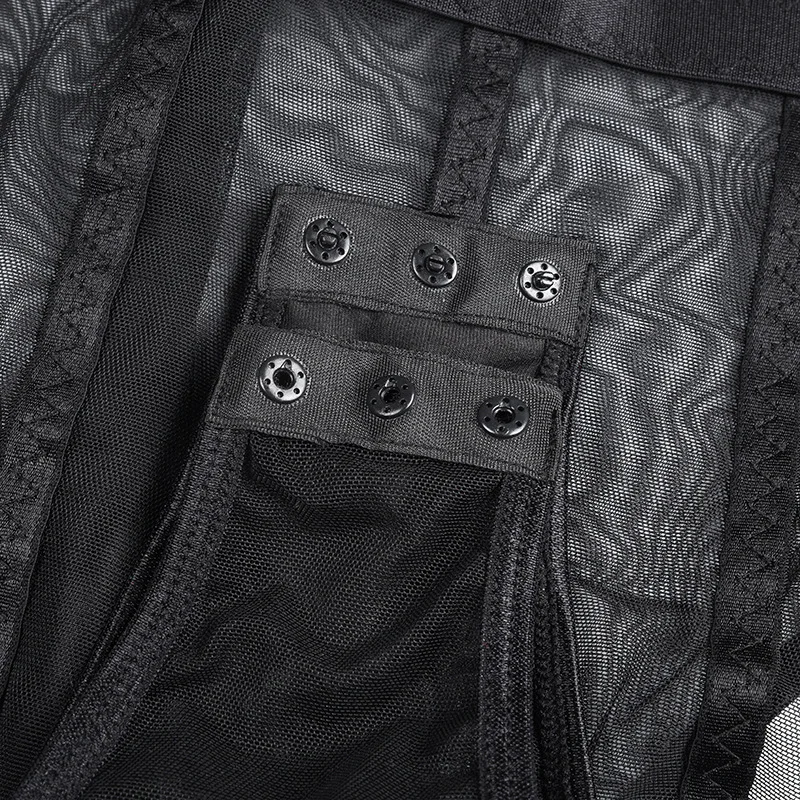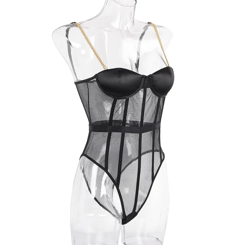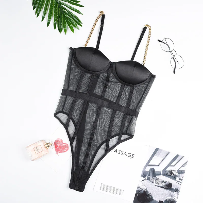 Сетчатый газовый облегающий боди для женщин, сексуальный черный облегающий корсет с металлической цепочкой для поддержки груди