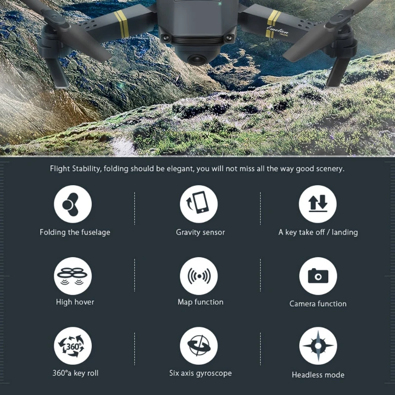 OOTDTYОсобенности на 100% абсолютно новый и высокого качестваСкладная рукоятка, маленький размер, можно легко положить в карман, легко носить с собой.Режим удержания высоты, Этот квадрокоптер с камерой имеет функцию удержания высоты, чтобы стабилизировать его полет. Вам не придется часто беспокоиться о стабильности дрона, вы можете фокусироваться на более эффективном захвате изображений.120 ° широкоугольный объектив дальность съемки, 720P высокой четкости аэрокамера может быть повернута.Атмосферное давление, один набор ключей, вы можете точно зафиксировать высоту и положение, стабильно парить, с любого угла съемки удобно.2,4 ГГц Высокая частота сигнала, renote Дистанция управления, поддержка нескольких летательных аппаратов, во время игры-помехи.Спецификация: Материал: АБС-пластикРазмер: Approx.5x27x19.5cm/1.96x10.62x7.67inchesСтиль: 4K двойная мощность посылка/4K три мощности посылкаПосылка включает в себя: 1 комплект дрона E58Примечание: 1. Допускается погрешность в 1-2 см из-за ручного измерения, убедитесь, что вы не возражаете перед заказом.2. В связи с разной конфигурацией разных мониторов изображение не отображает фактический цвет товара.