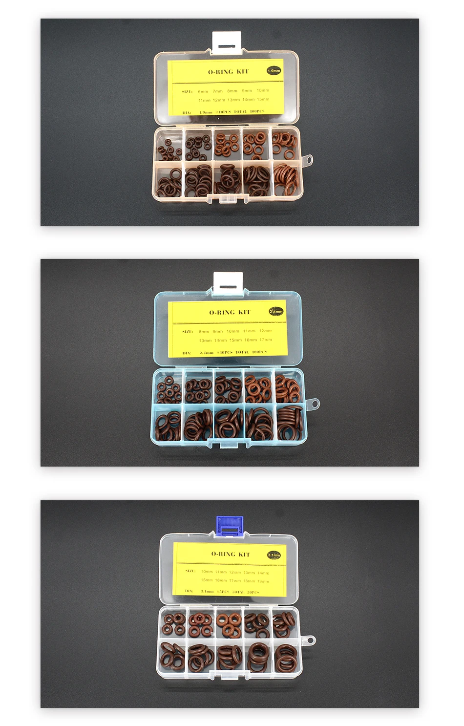Вы получите коробку, содержащую следующие десять размеров, по 5 каждого размера, всего 50 уплотнительных колец.