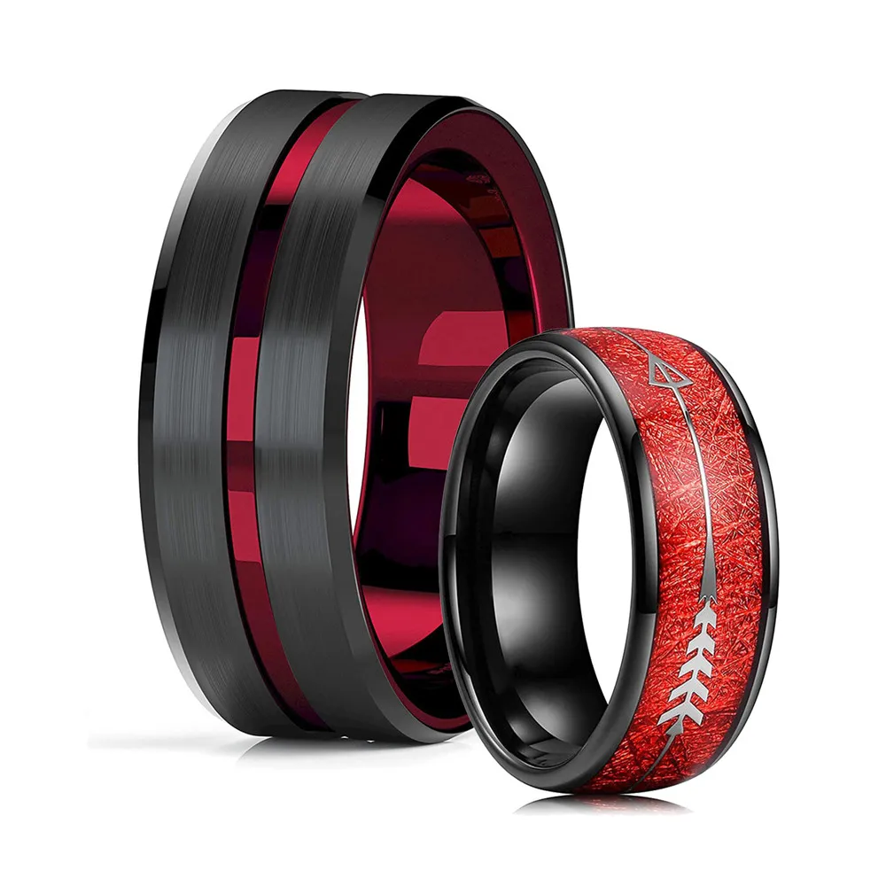 Новое мужское классическое красное кольцо со скошенным краем, черное обручальное кольцо из нержавеющей стали, инкрустированное красным метеоритом кольцо со стрелой, обручальное кольцо для мужчин