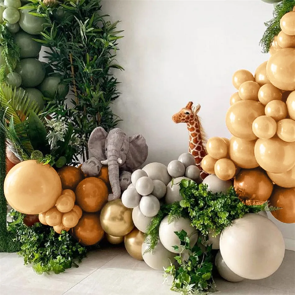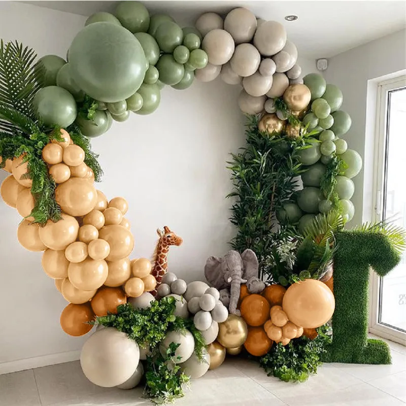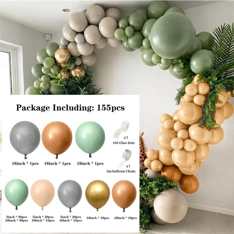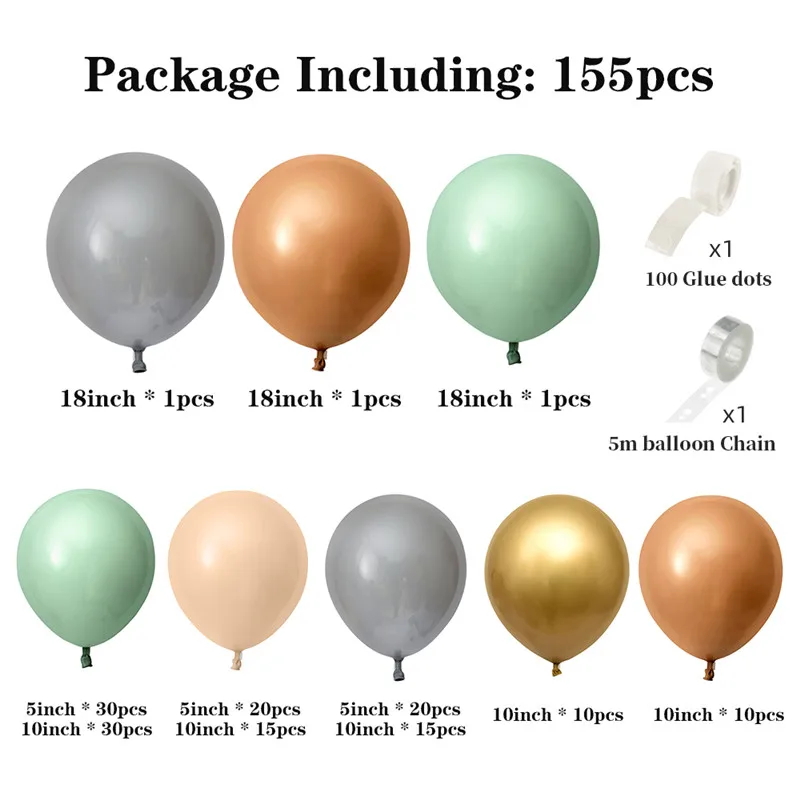 155 шт. зеленые шары:5 дюймов зеленые шары * 305 дюймовые бежевые воздушные шары * 205 дюймовые серые шары * 2010 дюймовые золотые шары * 1010 дюймовые коричневые шары * 1010 дюймов зеленые шары * 3010 дюймовые бежевые воздушные шары * 1510 дюймовые серые воздушные шары * 1518 дюймов серый шар * 118 дюймов коричневый шар * 118 дюймов зеленый шар * 1100 клеевых точек * 15 м цепочка для воздушных шаров * 1