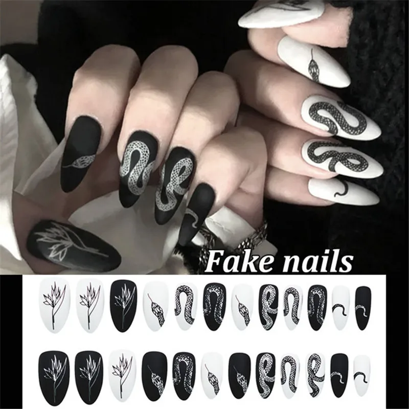 Накладные ногти в стиле темных панк с клеем и градиентом, 24 шт., длинный съемный огонь, дракон на ногтях, Череп, пламя, искусство, сделай сам, модный Маникюрный Инструмент