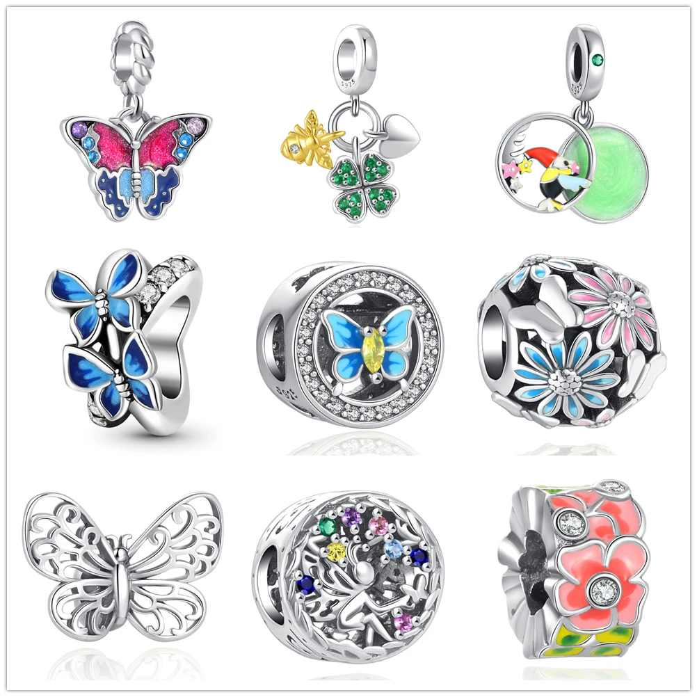 Новинка 2022, модный браслет с бабочками, цветами, птицами, искусственными элементами, подходят для Pandora, серебро 925 пробы, оригинальный браслет для женщин, ювелирные изделия, подарок