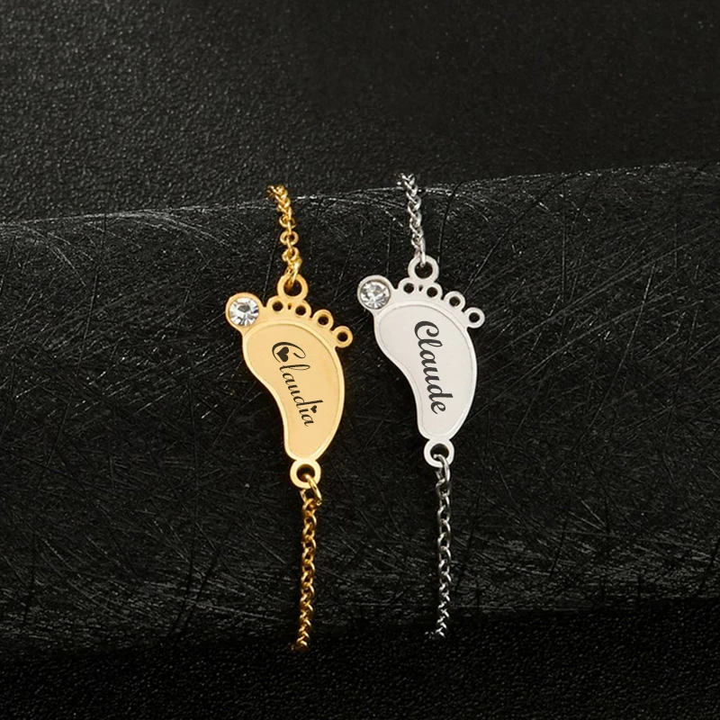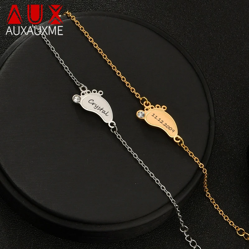 Браслет auxme с гравировкой на заказ, браслет с искусственной стопой из нержавеющей стали с кристаллами циркония, с именной табличкой для мамы, подарок на день рождения