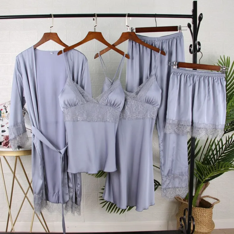Женская пижама 5 шт. шелковые комплекты Сексуальная кружевная ночная сорочка для женщин одежда для сна Женская домашняя одежда нижнее белье Пижамный костюм с подушечками