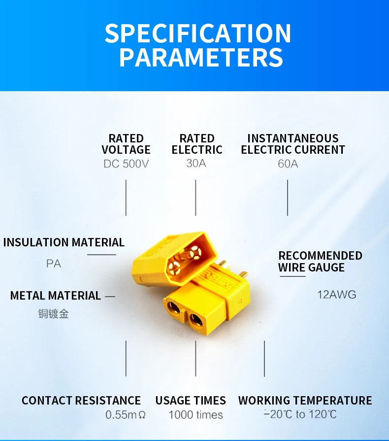 Feito de nylon de alta temperatura e conectores de mola banhados a ouro, ambos inclusidos no molde de injeço na época ao formar o conector.O xt60 garante uma conexão sólida de alto amplificador, perfeita para aplicaçóes de até e além de 65a constantesКаракули: