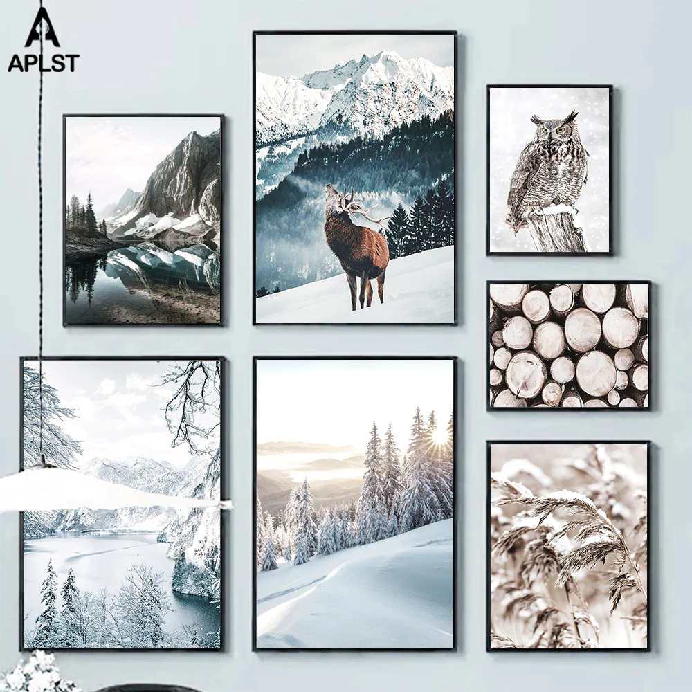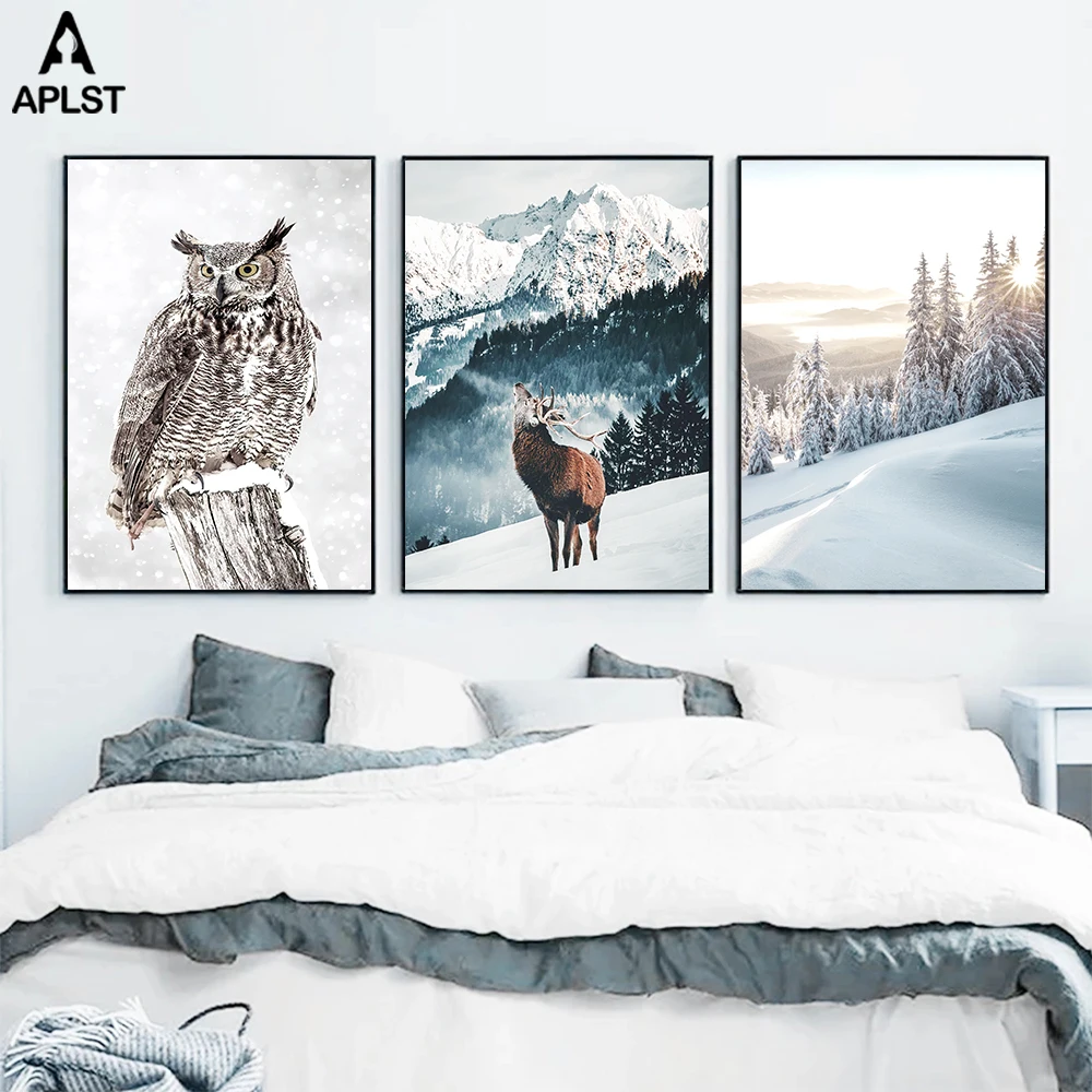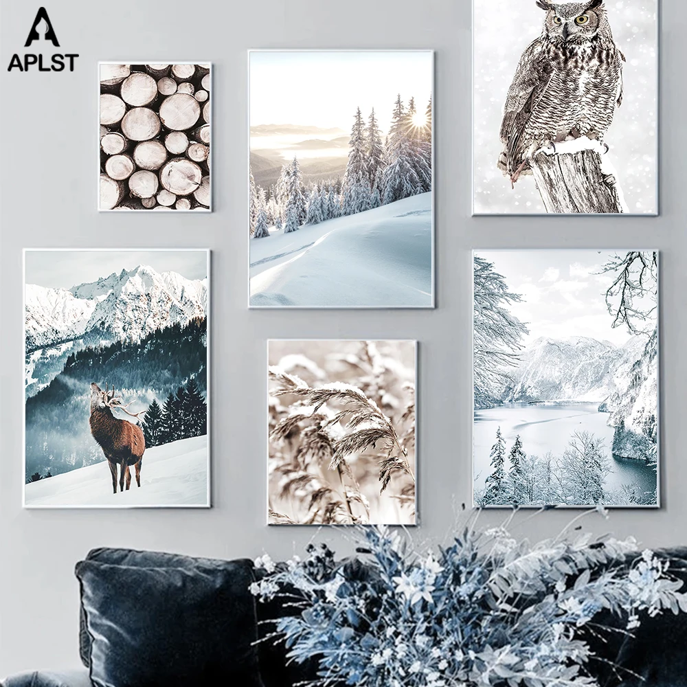 Зимний фон с рисунком животного, олень, снег, гора, восход солнца, ледяное озеро, Сова, тростник, современная картина, декор для гостиной