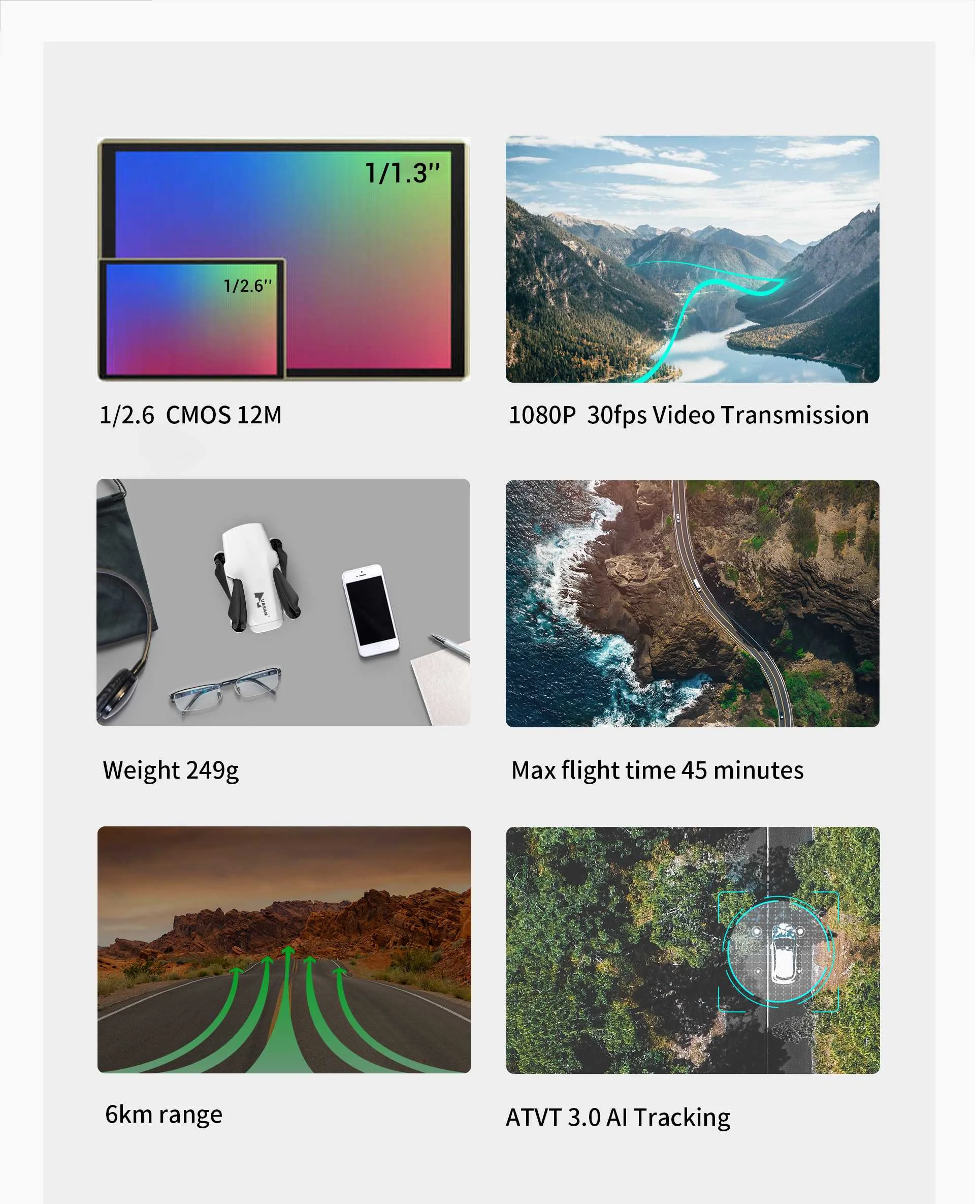 С 1/2.6 CMOS 12M,1080P 30fps видео передача и вес 249g, максимальное время полета 45 минут, 6 км Диапазон, ATVT 3,0 Al отслеживание