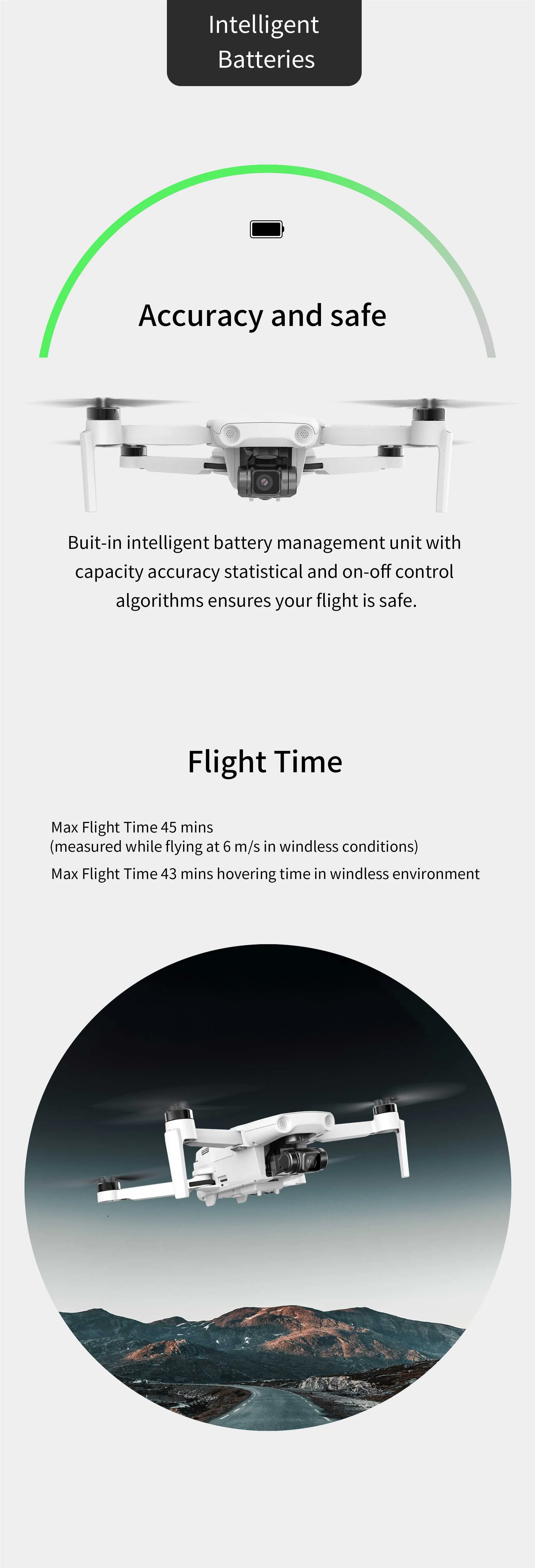 Точность и безопасностьBuit-in интеллектуальный блок управления батареей с точностью емкости, статистическими и ВКЛ-ВЫКЛ алгоритмами управления гарантирует безопасность вашего полета.Время полетаМаксимальное время полета 45 минут (измеряется при полете в 6 м/с в непродуваемых условиях)Максимальное время полета 43 минут время зависания в безветренной среде
