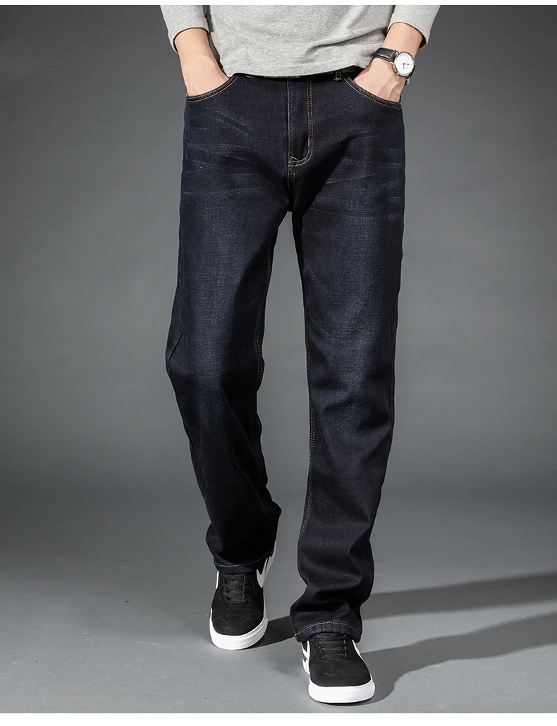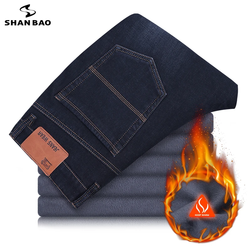 Зимние брендовые Высококачественные эластичные свободные прямые джинсы большого размера от SHAN BAO, толстые теплые джинсы с флисовой подкладкой для молодых мужчин и отцов, 2021