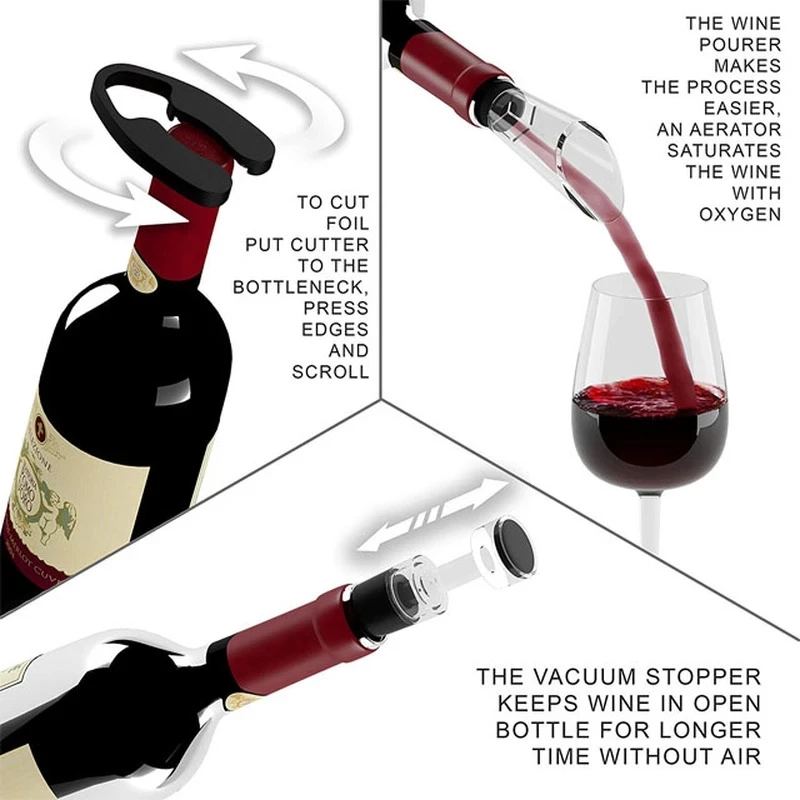 Особенности:1. Идеальный подарок: набор открывалок для вина включает в себя открывалку для вина, фольга резак, вино pourer, и вакуумные винные пробки.Что это идеальный выбор для подарка.2. Фольга резак: фольга резак помогает вам легко и быстро удалить уплотнение оловянной фольги. Просто положите фольга резакВертикально на герметизации бутылки и поверните вокруг нее, чтобы удалить уплотнение tinfoil.3. Вино: Просто вставьте вино в бутылку, чтобы легко вылить вино в ваш бокалСтаканчик, чтобы избежать проливания во время заливки.4. Вакуумная пробка: для лучшей защиты вина5. Открывалка для бутылок вина с воздушным давлением использует принцип вакуумного давления, прост в использовании и быстро открывается бутылка для винаСпецификация:Название: Набор открывалок для винаМатериал: ABS, нержавеющая сталь, алюминиевый сплавПосылка включает в себя:Винной штопор с воздушным насосом-1 шт.1 х Фольга резак1 х винная машина1 х вакуумная винная пробка