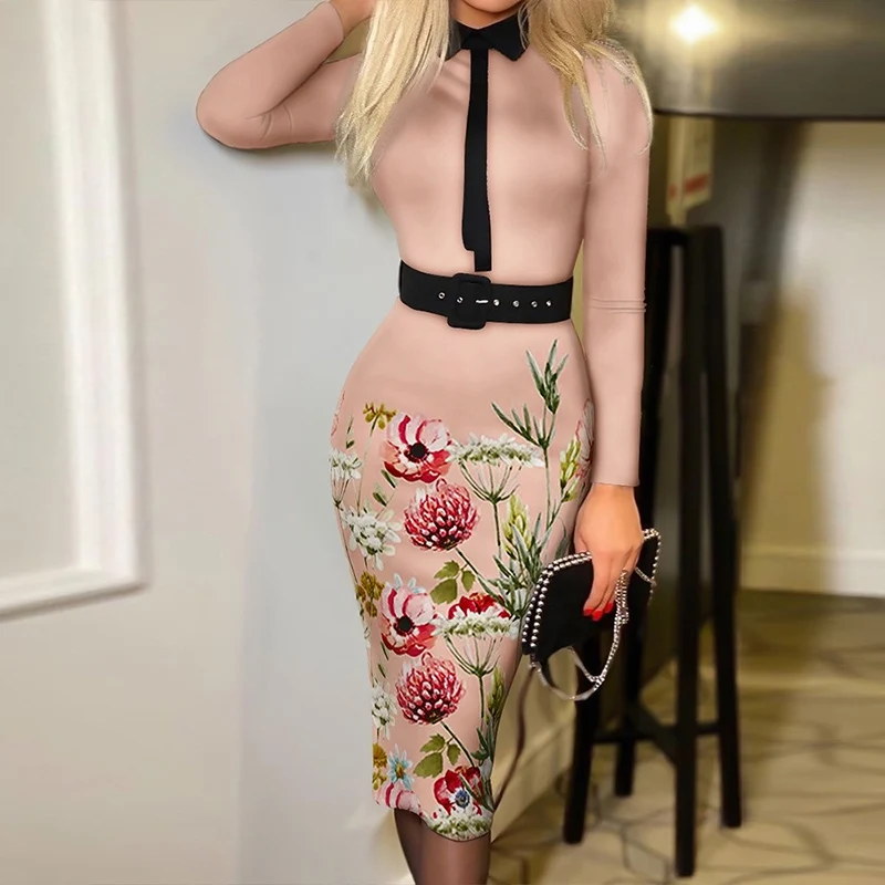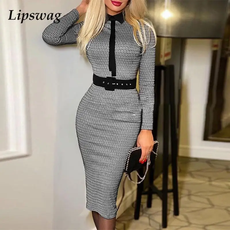 Элегантное облегающее платье с рисунком гусиная лапка и цветочным принтом, модное облегающее женское платье с лацканами, женское осенне-зимнее офисное платье для вечеринок с поясом