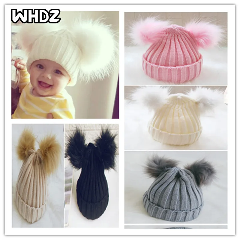 Совершенно новая зимняя теплая вязаная шапка для новорожденных девочек и мальчиков с пушистыми шариками и помпоном, однотонная теплая Милая Шапка-бини, шапка в подарок