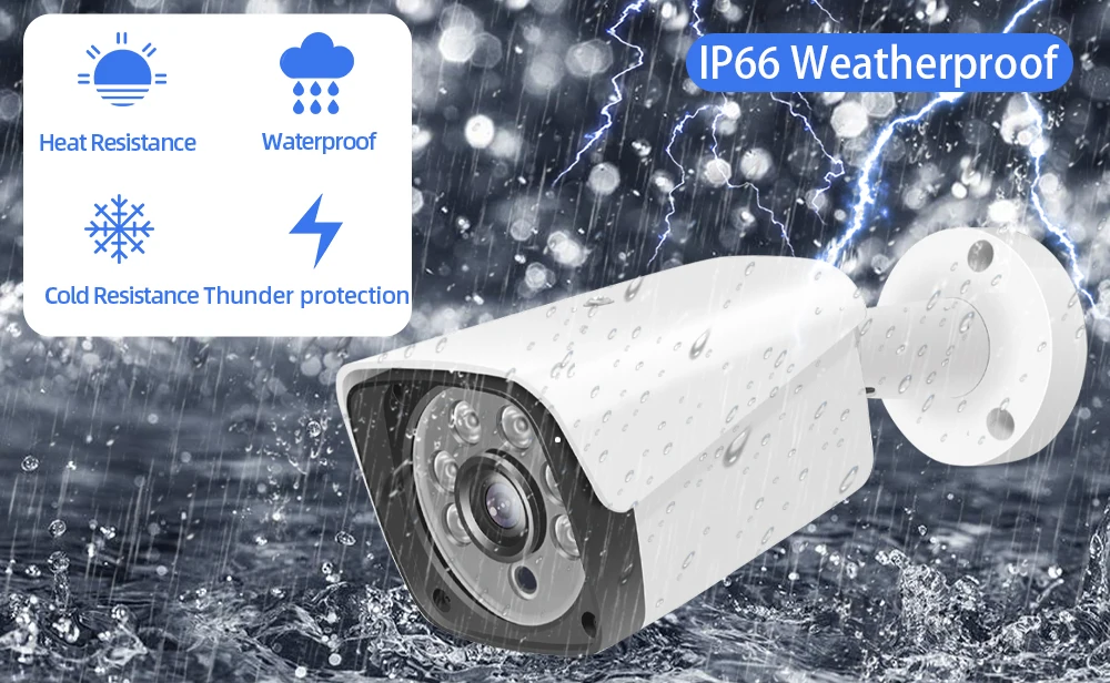 Используйте их как наружные или внутренние камеры, так как они крепко выдерживают любую погоду: дождь, снег, пыль и жаркие дни. Благодаря классу защиты от атмосферных воздействий IP66 и кабелям, продетым через подставку для обеспечения дополнительной защиты, вы сможете ответить на их работоспособность, день за днем. В нашей камере используется сверхпрочный металлический корпус, профессиональный водонепроницаемый IP66, обеспечивающий стабильную производительность как в помещении, так и на улице.