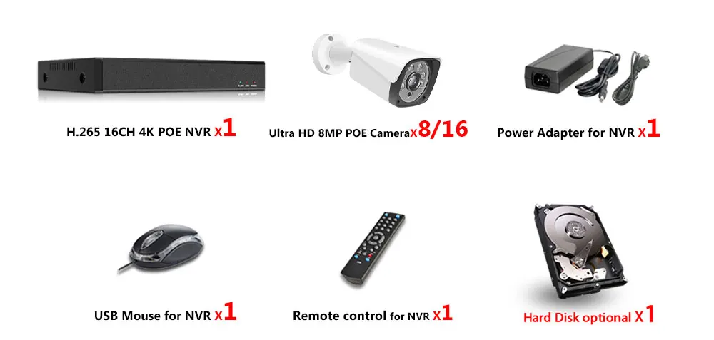 1 сетевой видеорегистратор 16 каналов 4K POE NVR;8/16X HD POE IP 8,0 МП Наружные камеры дневного и ночного видения с защитой от атмосферных воздействий;1 блок питания для сетевого видеорегистратора;1 USB-мышь для сетевого видеорегистратора;1 компакт-диск с программным обеспечением для сетевого видеорегистратора;1 х пульт дистанционного управления для сетевого видеорегистратора;Жесткий диск опционально!